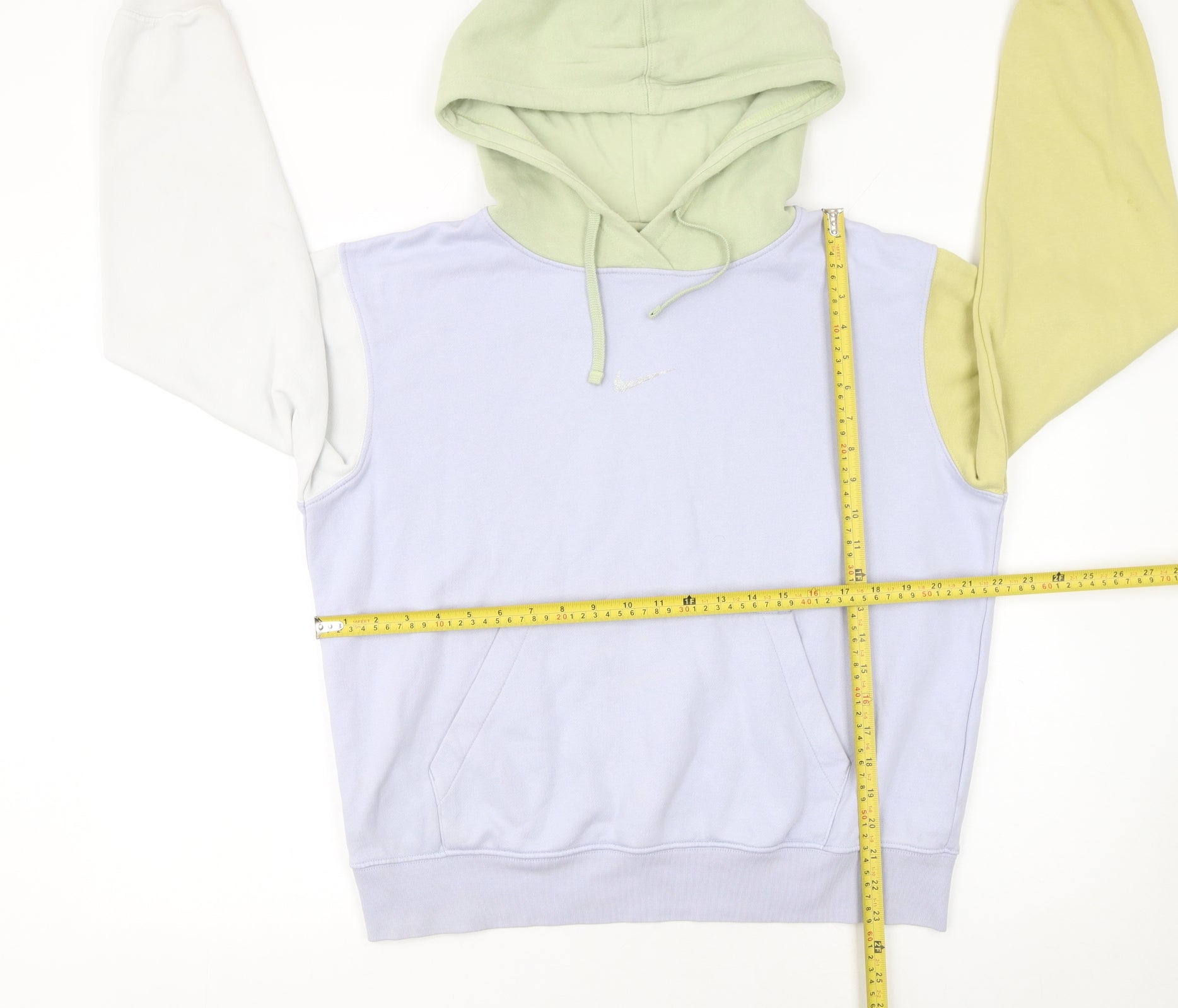 Add a splash of colour to your casualwear with this stylish Nike women’s multicoloured hoodie. Designed with a soft cotton-blend fabric, this pullover hoodie offers the perfect combination of comfort and sporty style. The pastel tones of lilac, green, white, and yellow give it a fun colourblock aesthetic that stands out, while the classic Nike logo embroidered on the chest adds an instantly recognisable finish. Featuring long sleeves with ribbed cuffs and hem, as well as a roomy front kangaroo pocket, this hoodie is a go-to choice for lounging, workouts, or weekend adventures. The drawstring hood ensures a snug, adjustable fit, perfect for layering during chilly mornings or relaxed afternoons. Made from 80% cotton and 20% polyester, the fabric feels soft yet durable, providing breathability and ease of care. Ideal for all seasons, this hoodie balances practicality and streetwear appeal. Whether paired with jeans, joggers, or leggings, it blends comfort and fashion effortlessly. With its easy-going relaxed fit, lightweight fleece interior, and versatile design, this is a must-have piece for those who love comfort with a touch of personality. A wardrobe staple that reflects Nike’s sporty DNA, reimagined in a playful pastel palette to brighten up any outfit.