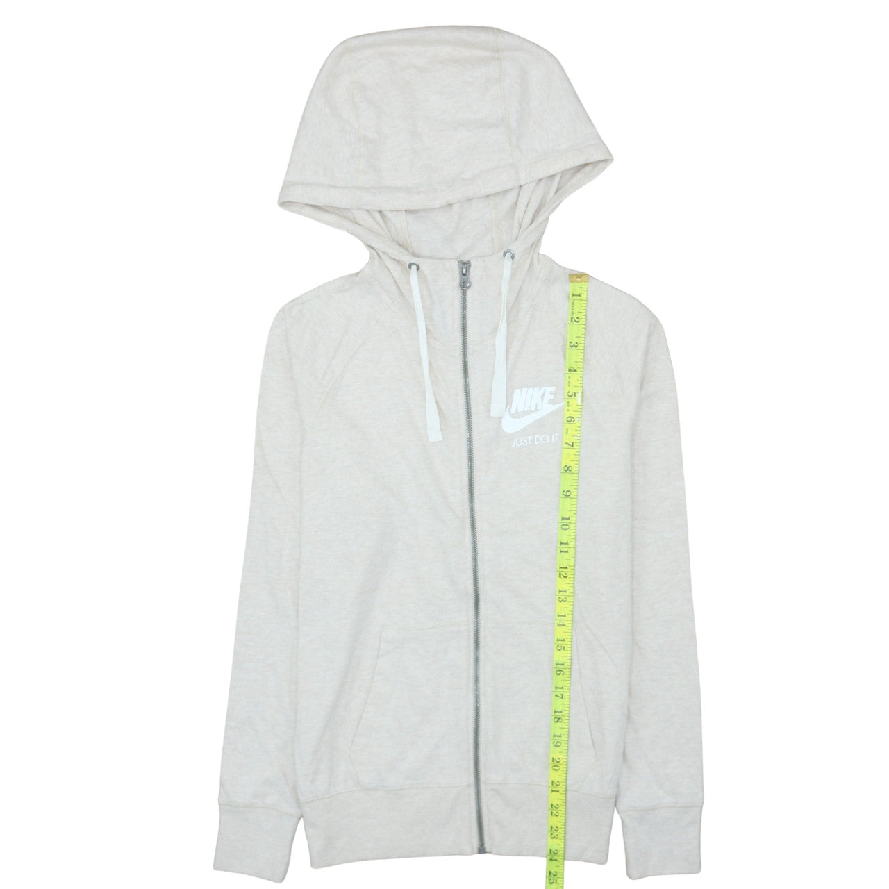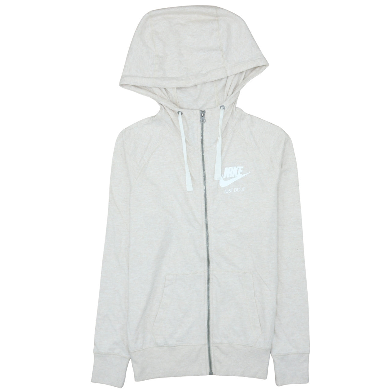 This Nike Women’s Beige Full Zip Hoodie offers everyday comfort with a sporty design perfect for both active and casual wear. Made from a soft 60% cotton and 40% polyester blend, this hoodie provides a breathable yet durable finish ideal for year-round use. The organically grown cotton offers a natural, lightweight feel while the recycled polyester adds strength and ensures the piece maintains its shape wash after wash. The light beige shade gives it a clean, versatile appearance that complements any outfit. Designed with Nike’s signature ‘Just Do It’ logo printed on the chest, it adds a classic, instantly recognisable style statement. The hoodie features a full front zip closure for easy wear, drawstring hood for adjustable comfort and two front hand pockets for added practicality. With ribbed cuffs and hem for a snug fit, it’s a wardrobe essential for layering during cooler evenings or warming up before a workout. Perfect for running errands, heading to the gym, or lounging at home, this piece combines athletic heritage with modern eco-conscious craftsmanship. In excellent pre-owned condition, this hoodie shows minimal signs of wear with no visible stains or damage, ensuring plenty of life left in it. Whether teamed with leggings, jeans, or joggers, this timeless Nike hoodie remains a dependable choice for women who value style, comfort, and functionality.