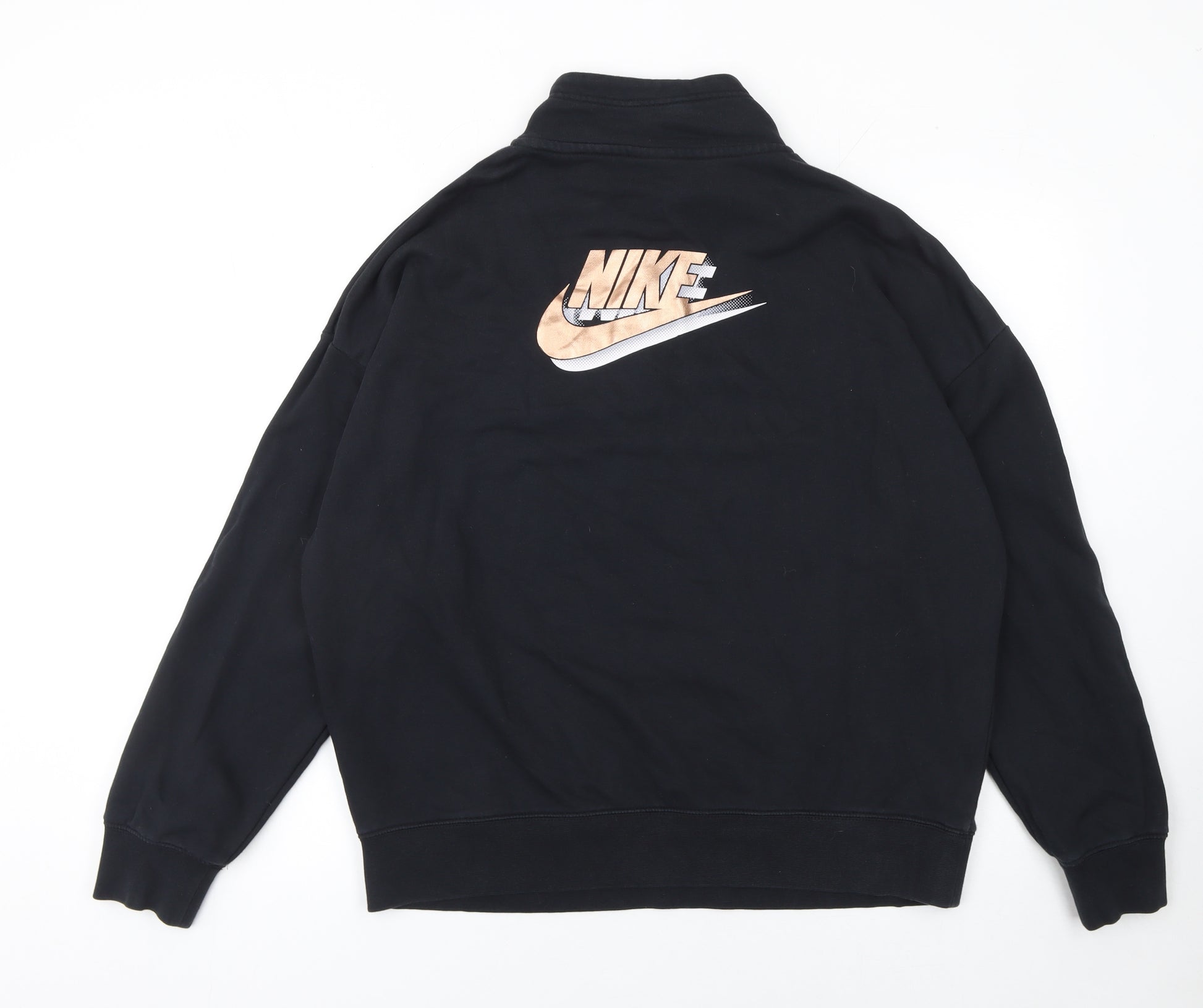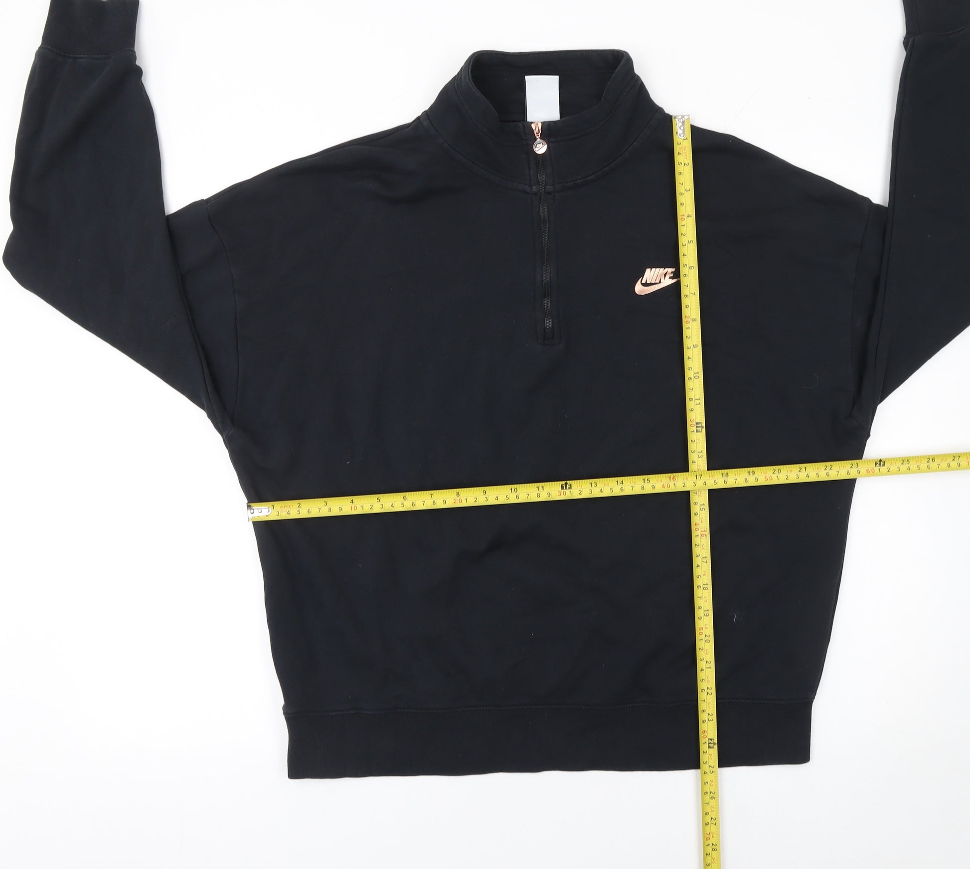 Elevate your casual sportswear wardrobe with this Nike Women's Black 1/4 Zip Oversized Fit Sweatshirt, a perfect fusion of athletic performance and everyday comfort. Crafted from a soft cotton-polyester jersey blend, this cosy pullover delivers breathable warmth and a laid-back streetwear silhouette. Featuring Nike’s iconic swoosh logo in a stylish gold tone on both the chest and back, it offers a distinctive sporty touch while maintaining minimalist sophistication. The high mock neck with a quarter-zip fastening provides versatile styling and easy wearability, allowing it to pair effortlessly with leggings, joggers, or jeans. Designed in a relaxed oversized fit, this sweatshirt promotes freedom of movement, making it ideal for layering in cooler months or throwing on after a workout. With soft ribbed cuffs and hem for a secure fit, it ensures lasting comfort for casual outings, gym sessions, or weekend lounging. The black colourway ensures timeless style that never goes out of fashion, suitable for transitional wear across autumn, spring, and winter. This Nike sweatshirt captures the essence of modern athleisure, perfect for women who value both comfort and understated design. Whether you’re heading to the gym, running errands, or simply relaxing at home, this piece offers versatility and effortless appeal. In very good pre-owned condition with minor faint front marking, it remains a desirable, well-made piece from one of the world’s most loved sportswear brands. Offering superior comfort, sporty flair and enduring quality, it’s an essential addition to any wardrobe that can easily transition from activewear to stylish loungewear. Refresh your off-duty look with this premium Nike sweatshirt – a reliable staple for women who appreciate authentic athletic style, unbeatable comfort and timeless design.