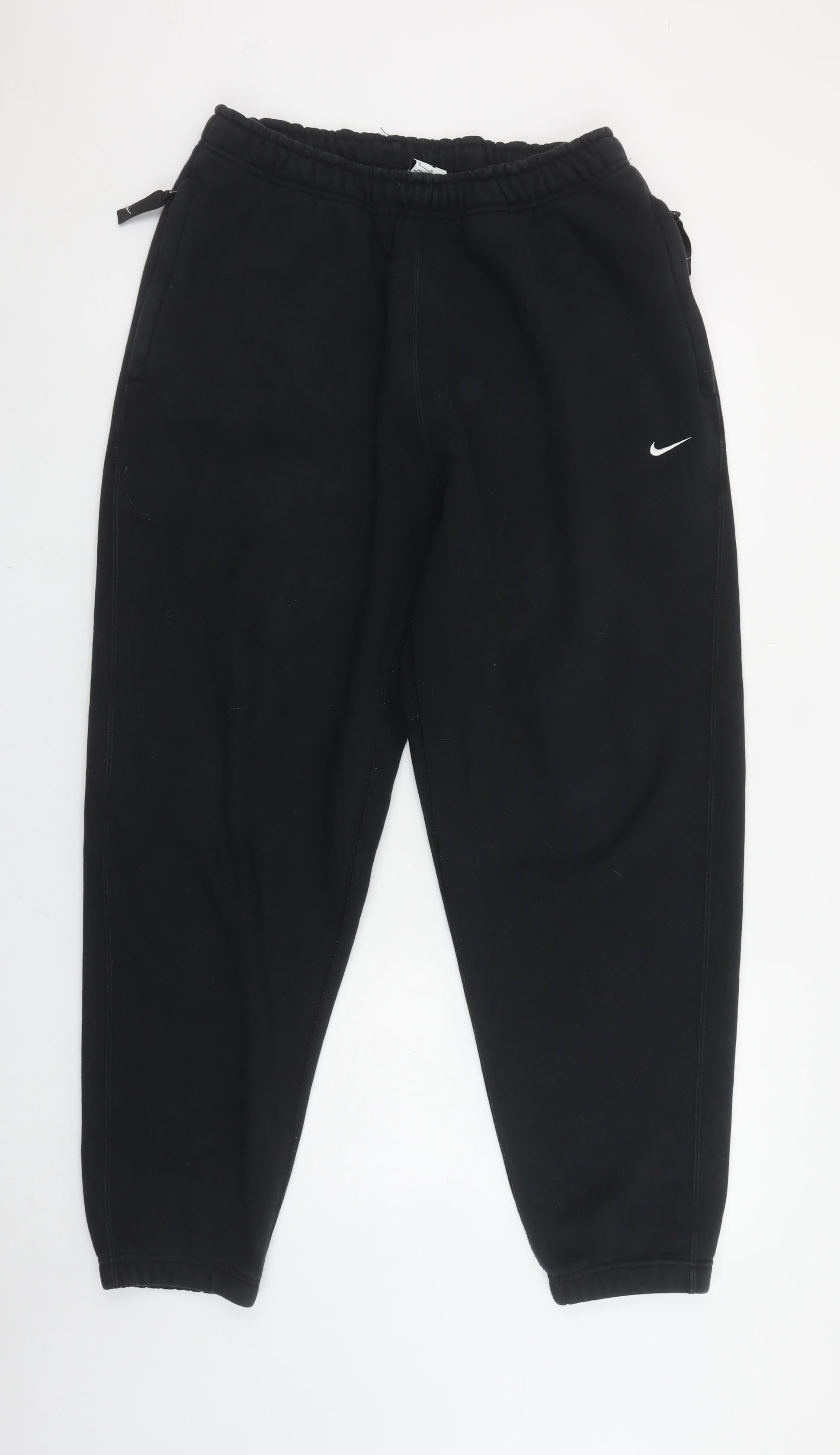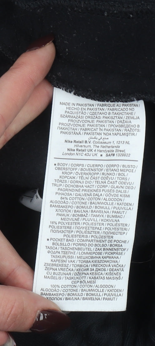 Embrace effortless sporty style and exceptional comfort with these Nike women's black fleece sweatpants in size M. Designed for both relaxed days and active moments, these trousers combine Nike’s quality craftsmanship with a timeless minimalist look. Crafted from a soft and durable blend of 84% cotton and 16% polyester, they provide the perfect balance between warmth, breathability and easy movement — ideal for year-round wear. The trousers feature a relaxed regular fit with a tapered leg, offering a flattering silhouette that looks equally stylish whether paired with a hoodie, sweatshirt or casual tee. The smooth fleece fabric provides cosy comfort, while the elasticated waistband with an internal drawstring ensures a secure and personalised fit. Finished with Nike’s iconic swoosh logo on the leg, these sweatpants immediately convey understated athletic appeal. Practical details include deep side pockets for everyday essentials, and elasticated ankle cuffs that keep the fit snug and comfortable. Perfect for casual outings, lounging at home or travel, these black Nike sweatpants offer versatile wearability across seasons — especially autumn and winter. The fleece material helps retain warmth without feeling heavy, making them suitable for layering or wearing solo. The absence of patterns and subtle detailing keeps them easy to coordinate with a wide range of sportswear and leisure looks. In very good pre-loved condition, these Nike joggers show only minimal signs of previous use, with light fading that does not detract from overall appearance or performance. Machine washable and easy to care for, they are set to become a wardrobe staple for women who appreciate comfort, durability and timeless sporty design. Invest in everyday comfort with these authentic Nike fleece sweatpants — a must-have blend of practicality, softness and style.