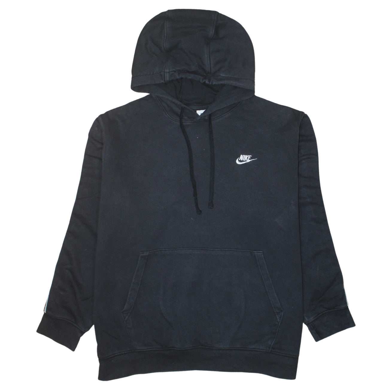 Elevate your casual wardrobe with this classic black Nike hoodie, designed for ultimate comfort and effortless style. Crafted from a soft and durable cotton-polyester blend, this medium-sized women's pullover hoodie combines practicality with a sporty edge. Featuring Nike's iconic swoosh logo embroidered on the chest and stylish branded tape detailing along the sleeves, it adds a bold, athletic touch to your everyday outfits. The adjustable drawstring hood and front kangaroo pocket provide warmth and functionality, making it perfect for layering during cooler seasons or casual active days. With a relaxed yet flattering fit, this hoodie ensures freedom of movement and long-lasting comfort whether you’re heading to the gym, lounging at home, or out and about. The ribbed cuffs and hem enhance the fit, helping to keep you comfortable while maintaining shape after every wear. Ideal for all seasons, this hoodie works effortlessly with jeans, joggers, or leggings for a versatile streetwear look. Condition is excellent with minimal signs of wear, making it a perfect addition for anyone who loves comfort combined with premium Nike performance styling. A must-have for those who appreciate quality sportswear that easily transitions from workout-ready to weekend casual, this Nike pullover is an investment in timeless versatility and sporty chic appeal.