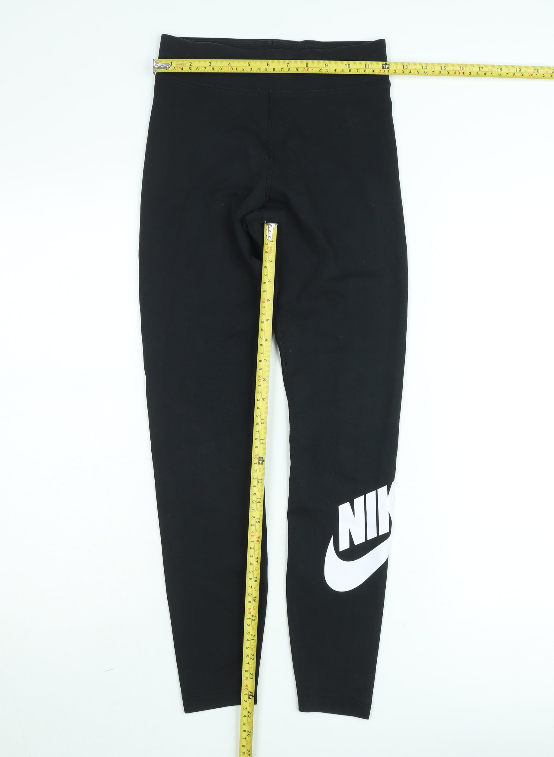 Stay stylish and comfortable in these classic black Nike women’s ankle leggings, perfect for both fitness and everyday wear. Constructed from a premium blend of 57% cotton, 33% polyester, and 10% elastane, these leggings offer superior stretch, comfort, and durability, allowing you to move freely through your daily routine or workouts. The fabric has a soft jersey texture that feels smooth against the skin while maintaining breathability throughout the day. Designed with a flattering high-rise waistband and a sleek silhouette, these leggings enhance your shape while providing reliable support. The elastic waist design ensures a secure and comfortable fit, ideal for any active or casual occasion. The iconic Nike logo printed along the lower leg adds an instantly recognisable touch of sporty authenticity and brand appeal. Whether you're heading to the gym, yoga class, running errands, or relaxing at home, these leggings deliver versatility and performance. Suitable for all seasons, they pair easily with sports bras, hoodies, or casual tops. The simple black colourway ensures endless styling options and a timeless, athletic look that matches every wardrobe. With their sleek style and minimal design, these leggings reflect a balance of comfort, performance, and fashion-forward appeal. These leggings are in excellent pre-owned condition with only very light signs of wear and no notable defects. Enjoy the acclaimed Nike quality and aesthetic at an affordable price. Ideal for modern women seeking a dependable and flattering pair of leggings for activewear or leisurewear. A must-have addition for anyone who values comfort, performance, and effortless style in their everyday essentials.