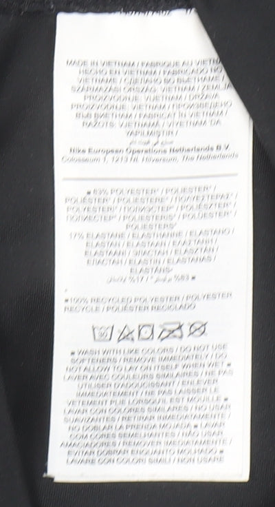 Stay comfortable and confident during every workout with these Nike Women’s Black Dri-FIT leggings. Designed with Nike’s moisture-wicking Dri-FIT technology, these leggings help keep you dry and cool by drawing sweat away from your skin, making them ideal for high-intensity training sessions, running, or yoga practice. The sleek black design features a flattering high-rise waistband that offers support and coverage, complemented by multiple white Nike Swoosh logos along the lower leg for an athletic and modern look. Made from a soft and stretchy blend of 83% polyester and 17% elastane, the leggings offer excellent flexibility while maintaining a close, comfortable fit that moves effortlessly with your body. The lightweight and breathable fabric enhances comfort and ensures ease of movement during all types of physical activity. Perfect for gym workouts, jogging or even casual athleisure wear, these slimming-fit leggings deliver both style and performance. The full-length design and smooth seams provide a sculpting silhouette that flatters while feeling second-skin soft. Made with quality craftsmanship in Vietnam, this pair is built to last and retains its shape wash after wash. In excellent pre-owned condition with minimal signs of wear, these leggings are a fantastic choice for anyone looking to upgrade their activewear collection with a trusted brand known for performance and design. Pair them with your favourite Nike sports bra or hoodie for a fully coordinated gym look. A versatile essential for all seasons — from summer training sessions to winter studio workouts — these leggings offer unbeatable comfort and a timeless sporty aesthetic. Get ready to move freely and feel your best with every stretch, stride, or squat. Perfect for fitness enthusiasts and anyone who values quality and confidence in their activewear.