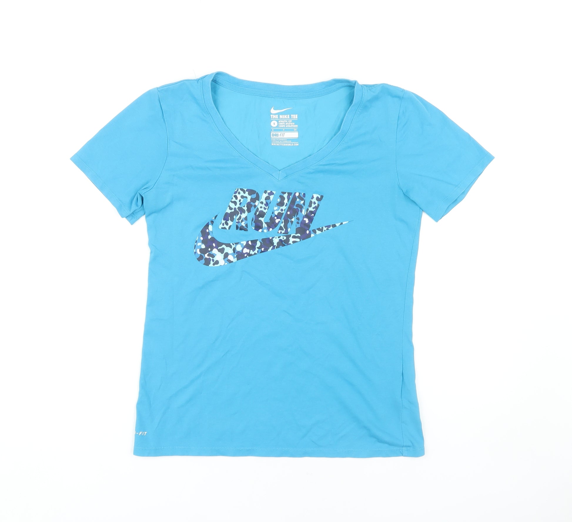 Enhance your workout wardrobe with this vibrant blue V-neck T-shirt from Nike, designed specifically for women who value both style and performance. Crafted from a breathable blend of cotton and polyester, this athletic tee is perfect for running and jogging enthusiasts. The moisture-wicking Dri-FIT technology ensures that you stay cool and dry even during the most intense workouts. With its sporty design, solid pattern, and classic short sleeve, this T-shirt brings both comfort and functionality to your activewear collection.Featuring an athletic cut for a flattering fit, this regular-sized tee is tailored for optimal movement and comfort. Its pullover closure makes it easy to wear, while the medium fabric wash ensures a fresh and clean appearance time after time. The T-shirt's lightweight jersey fabric allows for maximum flexibility, making it ideal for both high-impact exercises and casual wear.Whether you're hitting the gym, going for a brisk walk, or participating in your favourite sports activities, this versatile Nike tee is a reliable choice. Its all-season suitability means you can wear it year-round, and it's effortless to care for—simply machine wash, and it's ready to go.Perfectly combining fashion with functionality, this Nike women's athletic T-shirt is an excellent investment for those seeking durable and stylish activewear. Its vibrant blue colour and iconic branding will add a lively touch to any athletic ensemble, encouraging you to perform at your best. Upgrade your sportswear collection with this essential piece and experience the unmatched quality that Nike is renowned for.