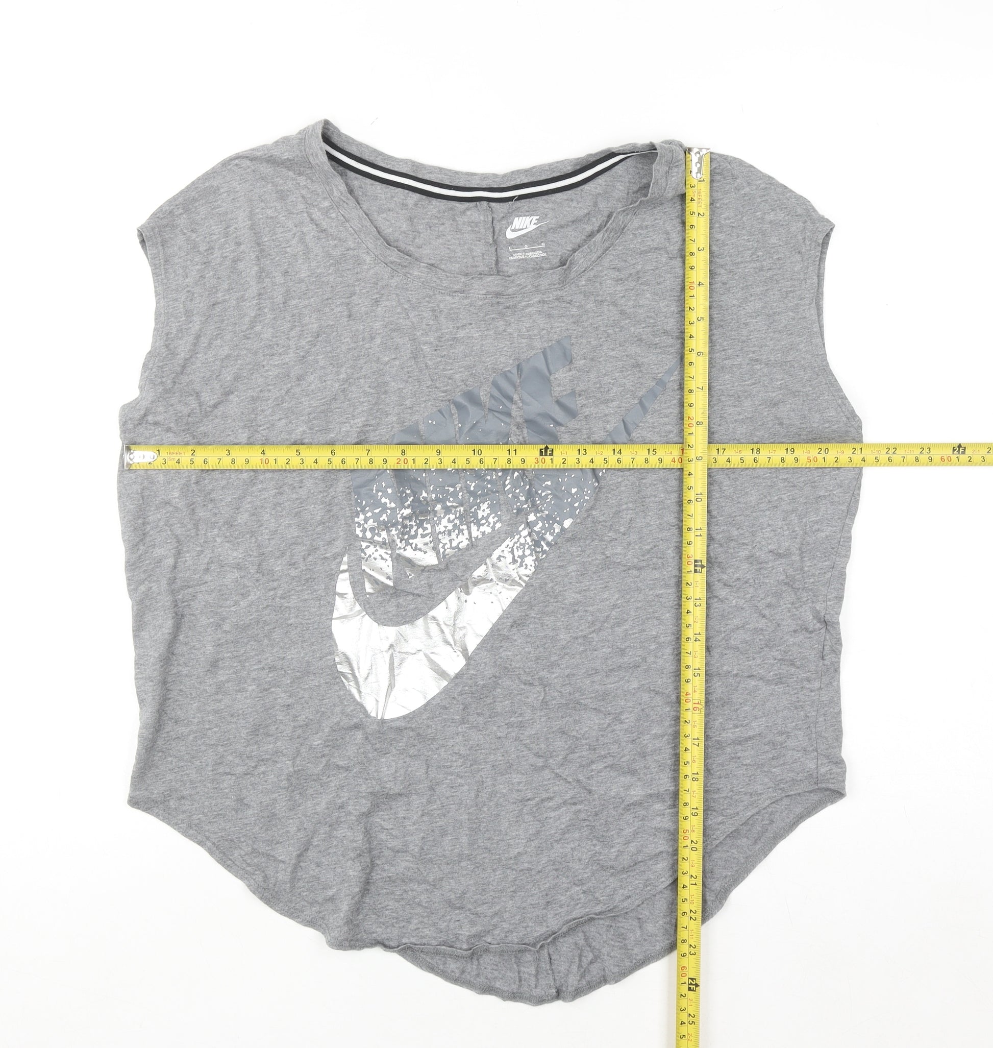 Refresh your casual wardrobe with this Nike women’s grey sleeveless tank top, designed for comfort, versatility, and relaxed everyday style. Crafted from a soft and lightweight jersey blend of cotton and polyester, this piece offers breathability and ease of movement, perfect for workouts or casual days out. The large metallic-style Nike logo across the front adds a touch of sporty flair, making it a stylish choice for active and off-duty looks alike. The crew neckline and loose fit ensure a comfortable, flattering silhouette that pairs easily with leggings, shorts, or jeans. Made in Cambodia, this tank top embodies Nike’s performance heritage with a modern, laid-back design ideal for layering or wearing alone during warmer seasons. The smooth, pullover fit and breathable soft-touch fabric make it a dependable favourite for gym sessions, lounging, or weekend activities. Its simple yet iconic design works seamlessly for spring and summer, while the grey tone makes it easy to mix and match with other wardrobe staples. In very good used condition with only light wear and minor creasing, this top is in excellent form, without stains or visible damage. Practical and fashion-forward, it’s perfect for those who love sporty minimalism and all-day comfort. Treat yourself to a Nike essential that combines a relaxed fit with a timeless style you can wear again and again—whether you’re hitting the gym or running errands, this sleeveless tank delivers effortless confidence and comfort from morning to night.