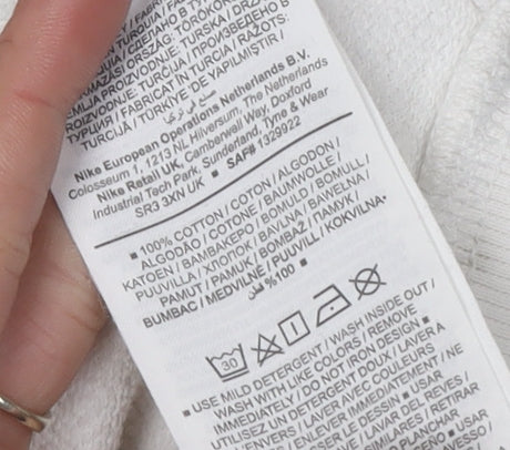 Elevate your casual wardrobe with this iconic Nike Women's Sweatshirt in a clean ivory shade. Made from 100% cotton, this piece promises comfort and breathability, making it perfect for any season. The relaxed fit is accentuated by the bold NIKE logo across the chest, adding a touch of sporty style to your look. With long sleeves and a classic crew neck design, this sweatshirt is versatile enough for any casual occasion or outdoor activity. Despite minor signs of wear, including a few stains, it remains in good condition and offers excellent value. Ideal for layering or wearing as a statement piece, this sweatshirt is your go-to for both comfort and style. Perfect for casual outings, gym sessions, or just lounging at home, integrate this piece into your collection for a timeless addition.