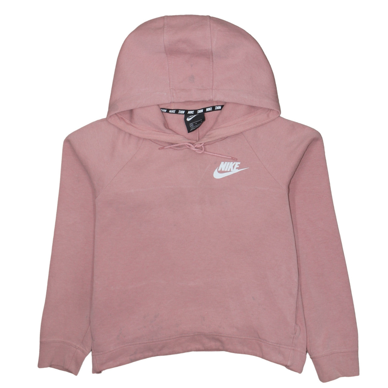Add a layer of athletic-inspired comfort to your wardrobe with this Nike women's pullover hoodie in a soft pink shade. Crafted from a breathable and durable cotton-blend fleece, this hoodie is designed to offer effortless comfort whether you're heading to the gym, relaxing at home, or out for a casual walk. The regular fit ensures a relaxed yet flattering silhouette, while the adjustable drawstring hood gives you extra warmth and protection against chilly weather. Finished with the iconic Nike swoosh logo printed on the chest, this piece captures timeless sporty style with ease. Constructed from 76% cotton and 24% polyester, the fabric provides a comfortable stretch and holds its shape wash after wash. The soft brushed interior adds warmth without bulk, making it an ideal choice across autumn, winter, and spring. Its classic crew neckline and raglan sleeve design provide unrestricted movement and a sporty edge to your outfit. The lightweight yet cozy materials make this hoodie a versatile choice for layering under jackets or over t-shirts. Perfect for a range of activities such as running, gym sessions, or casual weekends, this Nike hoodie blends practicality with signature brand appeal. The high-quality finish and durable stitching ensure long-lasting wear, while the pale pink tone adds a feminine touch to your athleisure rotation. Slight signs of wear and light marks are visible but do not detract from its overall appeal and comfort. Combine it easily with leggings, joggers, or skinny jeans for a complete look. This hoodie is ideal for those seeking a classic, durable, and stylish sportswear essential with unmistakable Nike branding and everyday comfort that transitions seamlessly from workout to downtime.