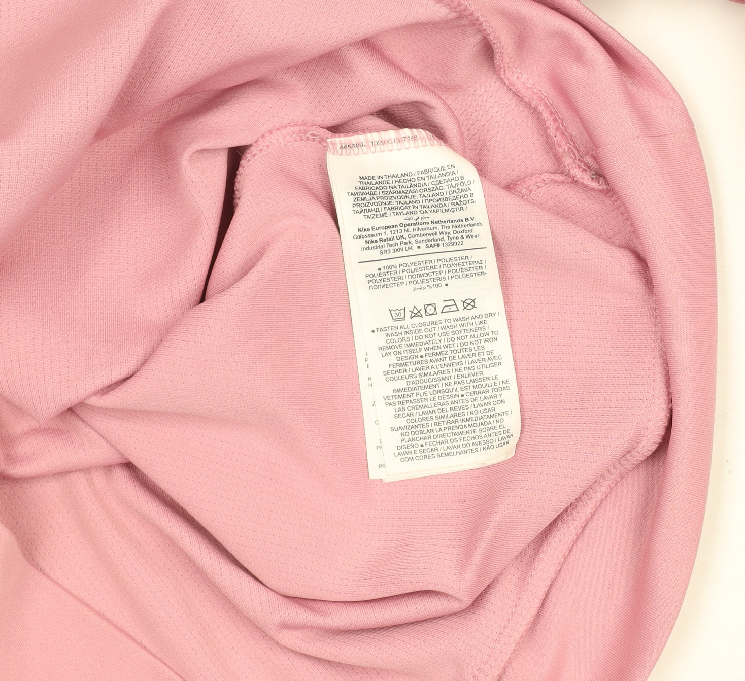 Stay comfortable and stylish during your workouts with this Nike Women's Dri-FIT running top in a soft pink colour. Designed with the active woman in mind, this top features a sleek quarter-zip front that allows for adjustable ventilation, making it perfect for cooler morning jogs or layering during outdoor activities. The high neck design adds warmth and protection, while the long raglan sleeves provide ease of movement whether you’re running, training, or stretching.Crafted from lightweight, breathable jersey fabric made of 100% polyester, this top boasts Nike’s signature Dri-FIT technology that wicks moisture away from your skin to keep you dry and comfortable through intense workouts. The athletic fit contours to your body without restricting movement, giving you a streamlined, sporty look. The large Nike swoosh logo on the chest complements its minimal yet dynamic design, making it a versatile choice for both activewear and casual wear.Ideal for running, gym sessions, or casual sportswear, this garment delivers a perfect balance of functionality and fashion. The thumbholes at the sleeve ends help keep the sleeves in place, offering extra coverage and warmth. Although this piece shows small marks on the fabric, it remains in good overall condition, with plenty of life and performance left. With proper care, this timeless sport essential will be a dependable companion in your fitness wardrobe.Combine it with your favourite leggings or running shorts for a coordinated athletic outfit, or layer it under a jacket for a sporty street look. A great addition for anyone looking for reliable, high-quality sportswear that blends comfort with the confidence of the Nike brand.