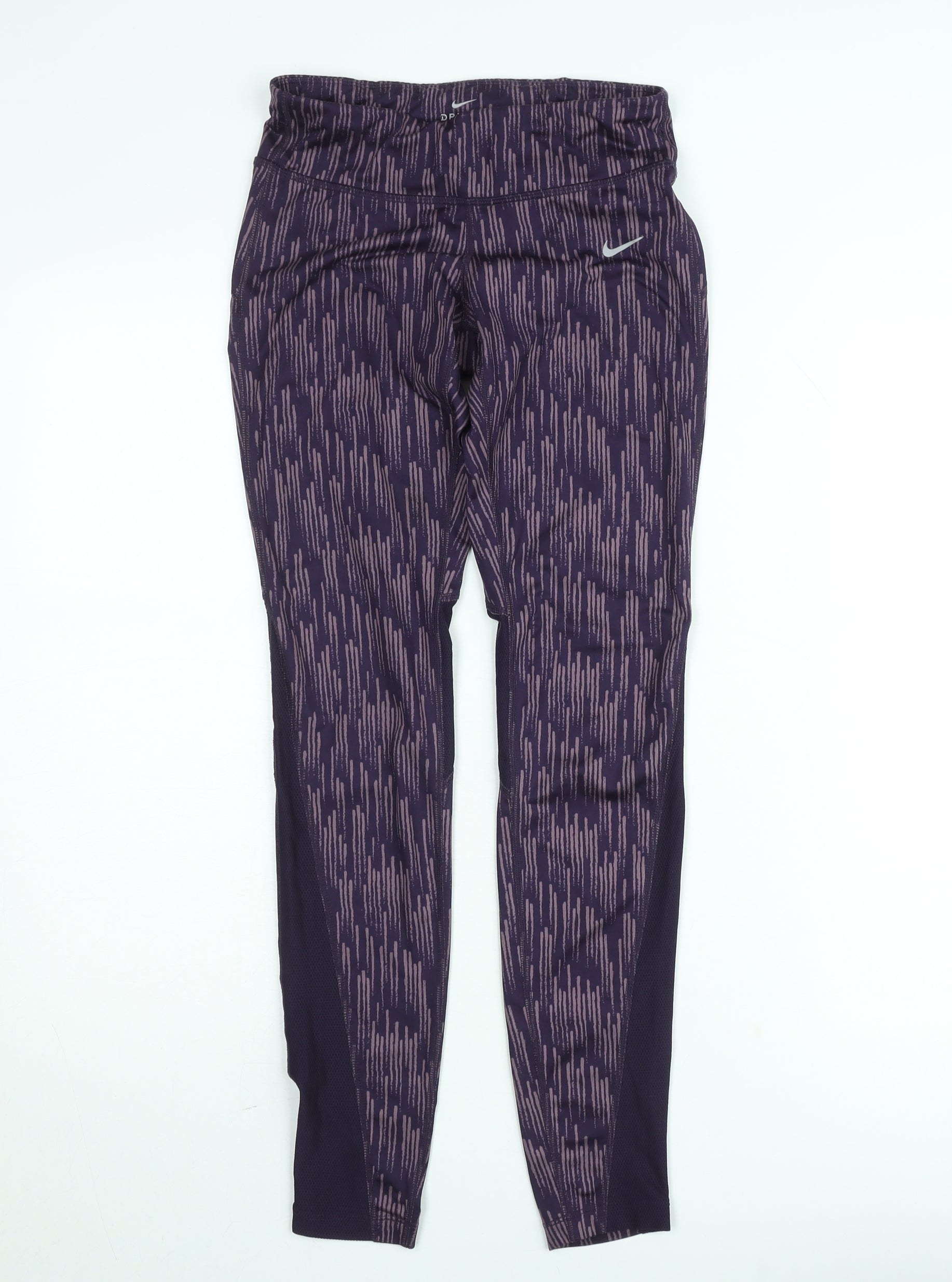 Upgrade your activewear collection with these Nike Women's Dri-FIT Leggings in a vibrant purple geometric pattern. Designed for performance and comfort, they feature Nike’s renowned Dri-FIT technology to wick moisture away and keep you dry throughout your workout. Crafted from a soft and stretchy blend of 87% polyester and 13% elastane, they move with your body for a flattering and supportive fit. These leggings are ideal for running, yoga, or any gym session, balancing function with stylish modern design. The mid-rise waistband ensures a secure fit, while the breathable, quick-drying fabric enhances comfort, making them an excellent choice for both indoor and outdoor training. The iconic Nike logo on the leg adds a subtle branded touch without compromising the sleek look. Suitable for all seasons, they layer easily for cooler days and keep you cool when temperatures rise. Perfect for women who appreciate high-quality performance gear with a stylish edge, these leggings deliver versatility and lasting wear. Their excellent pre-owned condition means they remain in great shape with no noticeable flaws, offering premium Nike performance at a fraction of the new price. Pair them with your favourite sports bra, tank top, or hoodie for a complete gym-ready outfit that looks as good as it feels. Whether you're running miles or running errands, these leggings provide the ideal blend of fit, functionality, and flair. Don’t miss your chance to add this versatile Nike activewear essential to your wardrobe — perfect for boosting your motivation and performance every time you train.