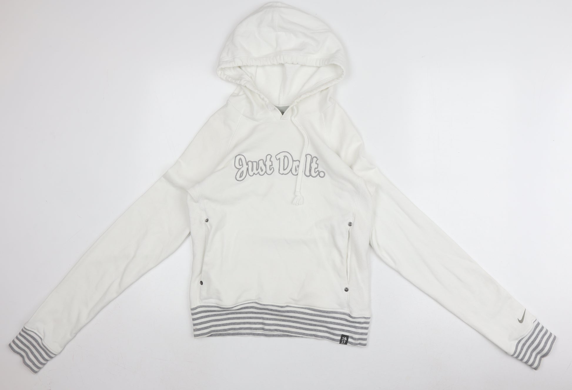Step out in style with this Nike Women's Pullover Hoodie in a classic white. Designed for casual wear, this hoodie embodies a relaxed yet sporty aesthetic—ideal for both gym sessions and relaxed weekend outings. Featuring a comfortable cotton and polyester blend, it ensures warmth while remaining breathable for all-day wear. The iconic 'Just Do It' logo adds a touch of flair, making it a must-have for brand enthusiasts. With a convenient drawstring hood, adjust to your preferred fit with ease. The long raglan sleeves offer freedom of movement and a stylish edge. Perfect for the modern woman, this versatile piece pairs well with jeans, leggings, or joggers for a laid-back look. Whether you're gearing up for a workout or heading out for casual errands, this hoodie stands out effortlessly. Maintain its freshness with easy machine wash care. Offered in size 10, it caters to regular fits. Despite mild wear with slight marks, it remains in excellent condition—a testament to Nike's durable design. Elevate your wardrobe with this timeless hoodie that defines both comfort and style.