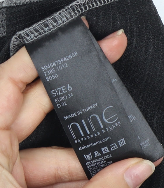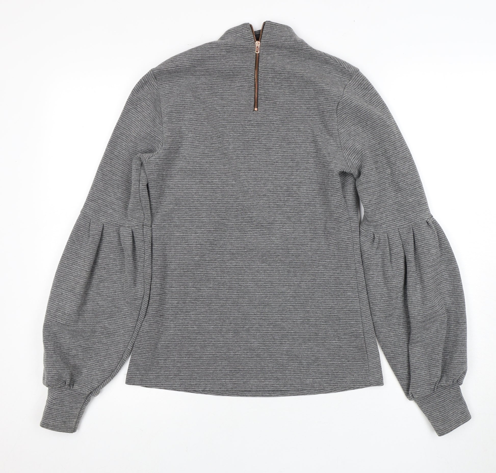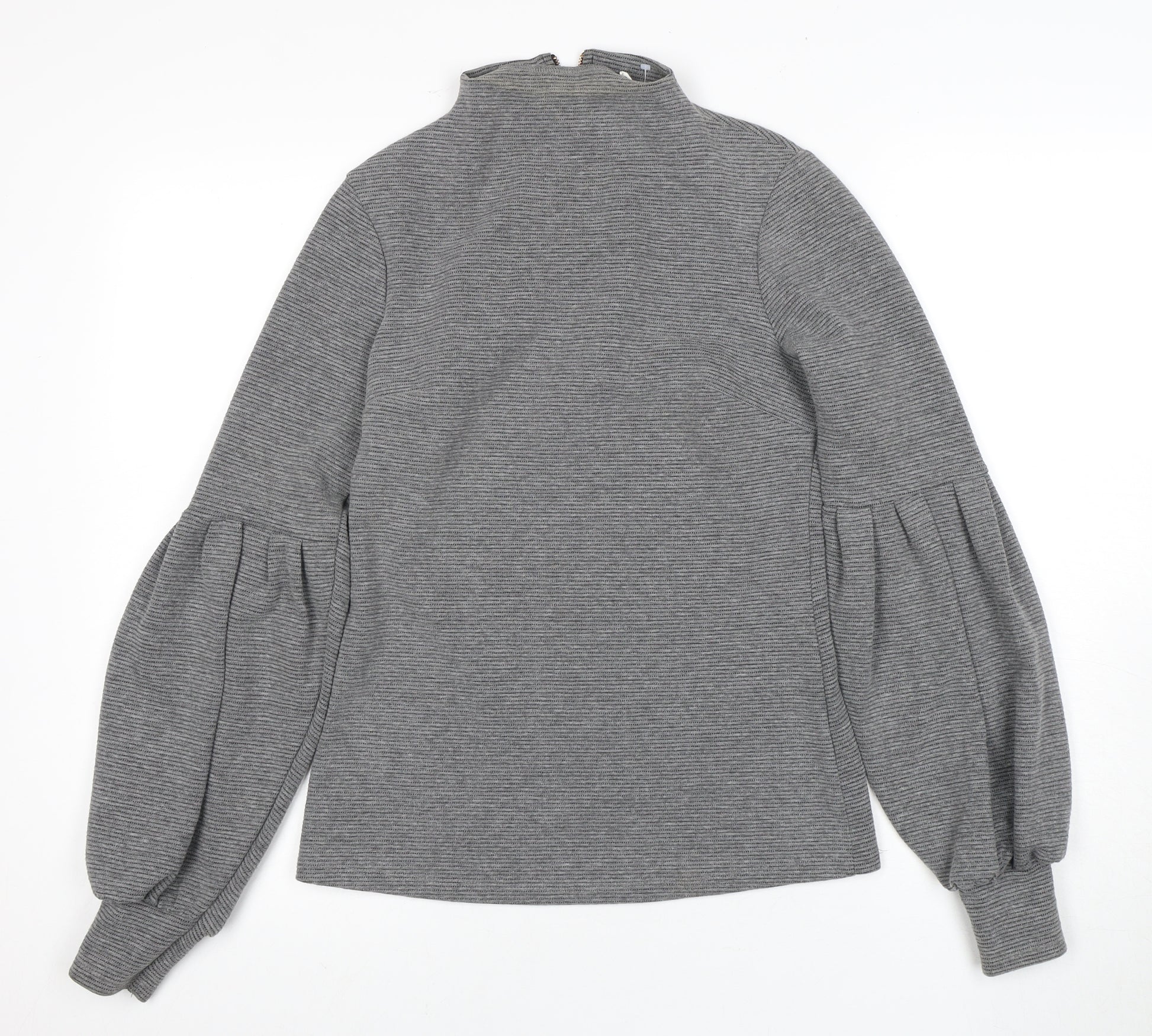 Enhance your wardrobe with this stylish balloon sleeve top by Nine Savannah Miller, perfect for adding a touch of sophistication to your outfit. Crafted with a modern high neck design and long sleeves, this elegant piece is ideal for both casual and semi-formal occasions. Made from a quality blend of polyester, cotton, and elastane, the knit fabric offers comfort and a flattering fit. The grey hue and subtle striped pattern provide a classic look that can easily be paired with trousers or skirts. A convenient zip closure at the back adds a touch of practicality and style. Don't miss out on this versatile piece that seamlessly combines style and functionality. A must-have for every woman's collection, this top promises to be a favourite all year round. Perfect for women seeking quality and style, this top is available in a size 6 and is in excellent condition. Priced affordably, it's a fantastic addition to any fashion-forward wardrobe.