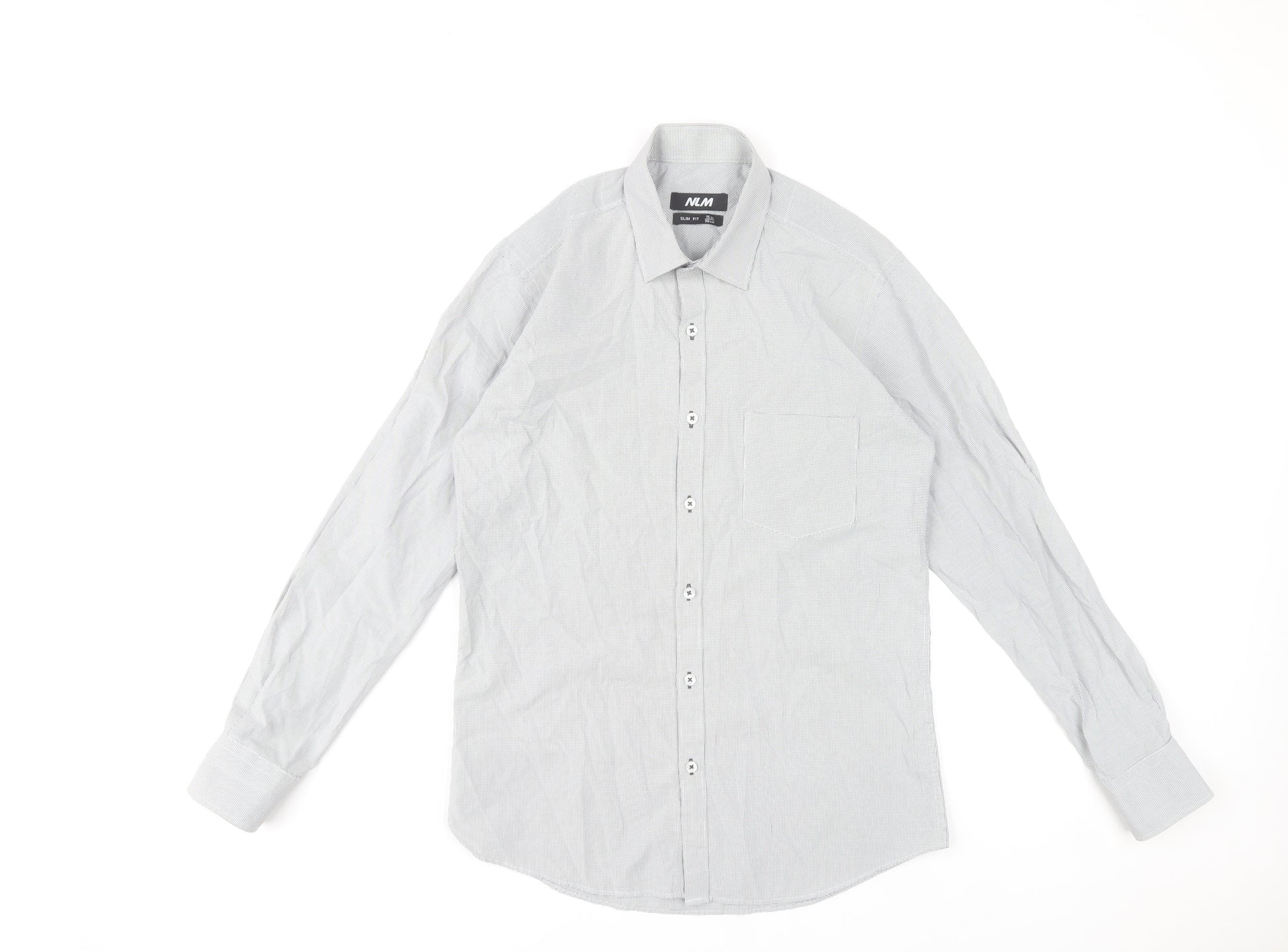 Elevate your formal and business wardrobe with this sophisticated NLM men's slim fit dress shirt in a versatile grey shade. Designed with care, this long sleeve shirt features a collared neckline, point collar style, and secure button closure, making it an excellent choice for formal occasions, business meetings, or daily office wear. The slim fit cut provides a contemporary silhouette that flatters the wearer, enhancing a sharp, modern look. Crafted from 100% cotton, the shirt offers lightweight comfort and excellent breathability, ideal for all-day wear. The woven fabric with a subtle solid pattern in grey ensures a timeless, professional style that pairs effortlessly with tailored trousers or formal suits. This shirt is finished with a neat barrel cuff and reinforced button accents, adding both practicality and a touch of refinement.The shirt comes in a neck size of 15 inches (38 cm) with a measured chest size of 50 cm and a shirt length of 75 cm, making it suitable for men seeking a regular size slim fit piece with precision tailoring. The shirt’s lightweight construction makes it perfect for year-round wear, while its machine-washable care instructions ensure convenience and easy maintenance.In very good pre-owned condition, this shirt shows only light creasing from storage, with no stains or damage, ensuring it remains ready for immediate stylish use. Whether you are attending a wedding, dressing for an important formal event, or refreshing your workwear rotation, this versatile shirt is a reliable option.Offering understated elegance, combined with practical wearability, this NLM slim fit grey shirt is a must-have addition to any man's wardrobe. Its classic style makes it easy to match with ties, blazers or formal trousers, providing countless outfit choices for a polished and distinguished appearance. Ideal for men who appreciate a refined look without compromising comfort, this shirt promises long-lasting wardrobe value.