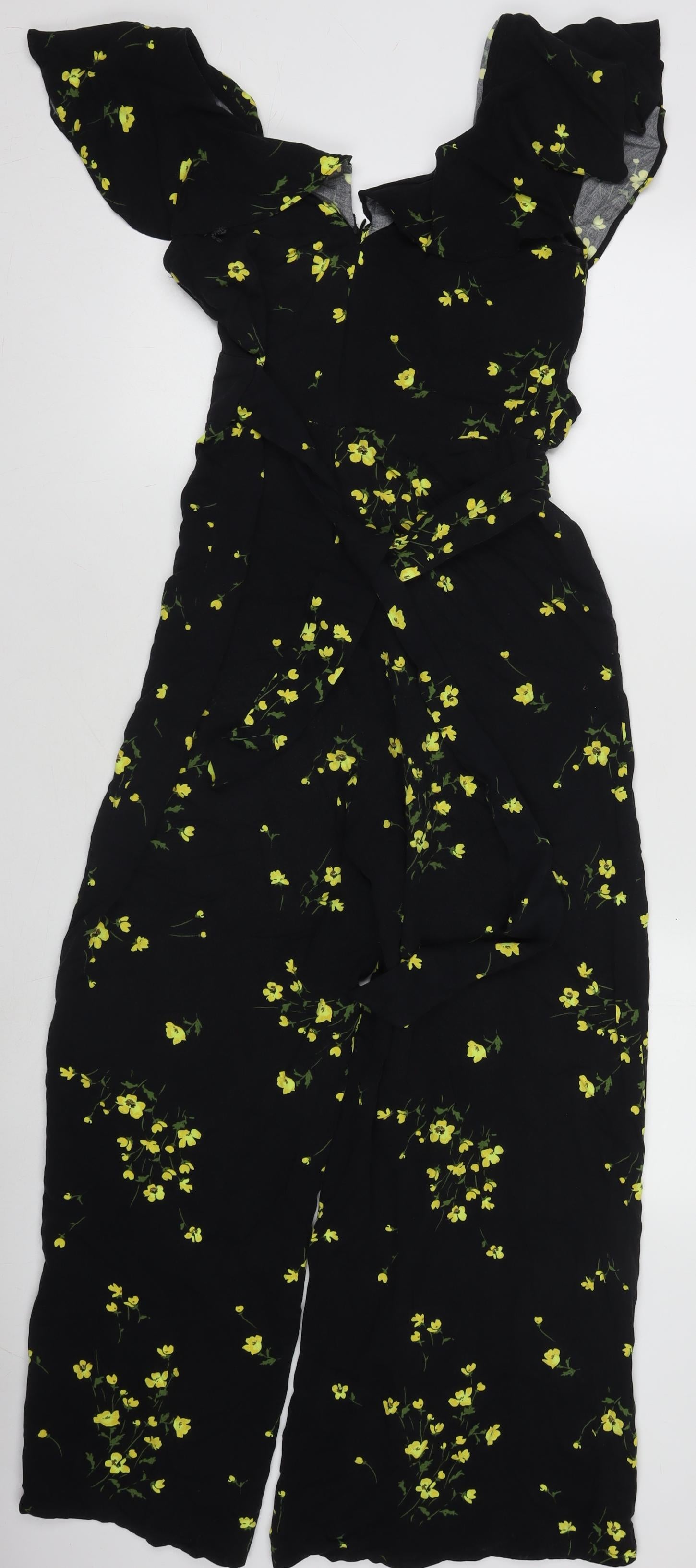 Nobody’s Child Women’s Black Floral Jumpsuit Size 8 Short Sleeve Wide-Leg