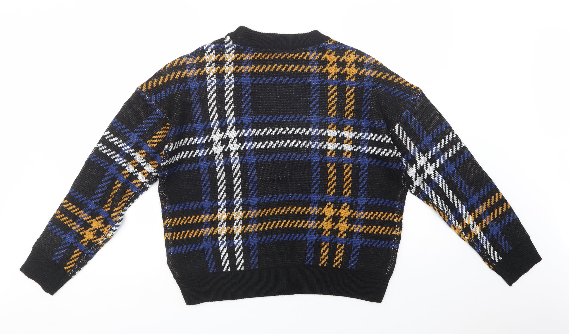 Womens Black Crew Neck Plaid Acrylic Pullover Jumper Size M