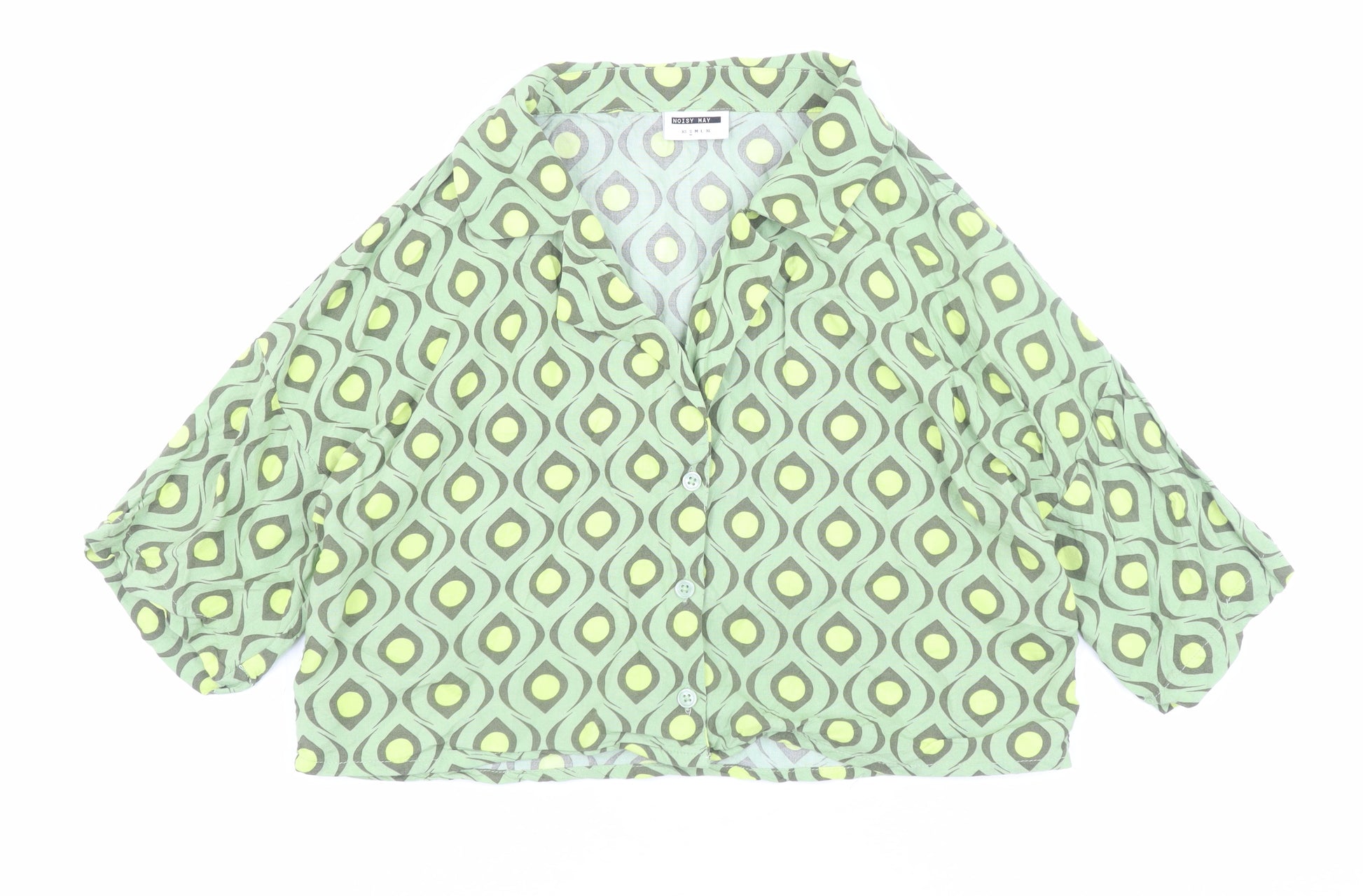 Inject some vibrant retro charm into your wardrobe with this distinctive Noisy May women's cropped button-up shirt. Designed in an eye-catching green geometric print, this piece combines modern relaxed tailoring with a nostalgic 70s-inspired aesthetic. Crafted from lightweight viscose, it offers a smooth, breathable feel that drapes beautifully, making it ideal for warmer seasons. The soft fabric moves naturally with the body while keeping you comfortable throughout the day. The shirt features a collared neckline and a front button fastening with 3/4 kimono-style sleeves, giving it a fresh, effortless silhouette. Its cropped cut adds a flattering, contemporary edge that pairs perfectly with high-waisted jeans, skirts, or tailored shorts for laid-back weekend wear or daytime outings. Designed for versatility, it can be styled both buttoned up for a polished finish or worn open over a simple tank top for a casual layered look. The relaxed fit ensures ease of movement, while the chic pattern brings a statement touch to any outfit. Ideal for spring and summer seasons, this shirt lends itself well to casual occasions but can also be dressed up with jewellery and heels for evening gatherings. In excellent pre-loved condition with no visible flaws, the quality of the garment remains high and well-maintained. Noisy May’s effortless contemporary styling is clear in this chic piece, offering both comfort and trend in one modern essential. The shirt’s fabric and print make it an appealing choice for those who love playful yet sophisticated fashion with a vintage twist. Whether you’re aiming for a bold retro outfit or simply want to elevate your everyday wardrobe, this geometric green button-up is a smart and stylish choice that blends individuality with wearability, ensuring you'll stand out in effortless style.