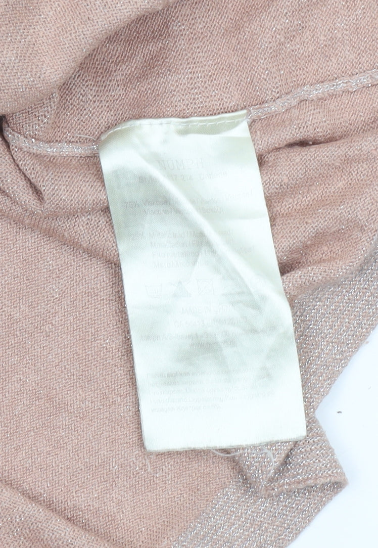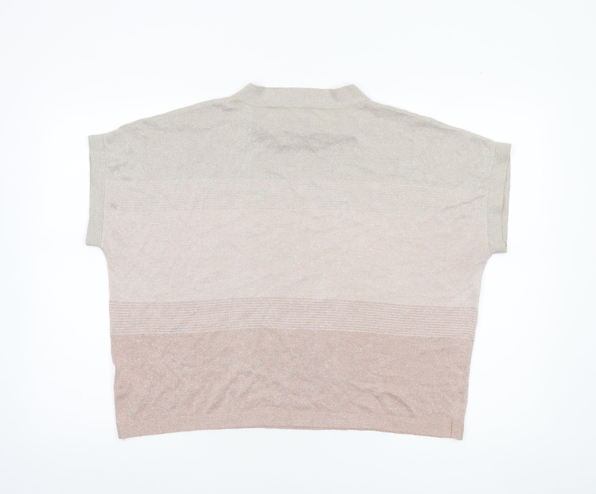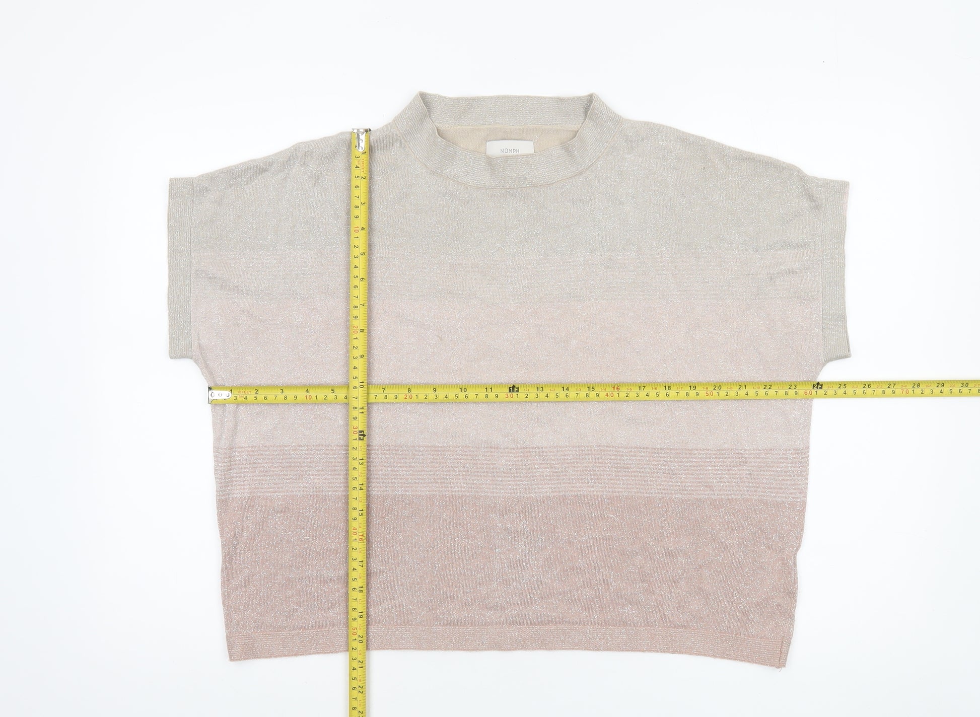 Embrace understated elegance with this beautiful Nümph women’s pullover jumper in a sophisticated beige gradient tone. Perfectly crafted in a fine lightweight knit, this stylish jumper brings a touch of shimmer to your everyday wardrobe thanks to its subtle metallic thread. The relaxed fit and slightly boxy silhouette provide effortless comfort while maintaining a contemporary look that flatters all shapes. Designed with a soft mock neckline and dolman-style short sleeves, the jumper drapes naturally over the shoulders and adds modern flair without compromising on ease or versatility. Made from a high-quality blend of 75% viscose and 25% metallic fibres, the fabric feels smooth and breathable against the skin, making it ideal for layering during spring and summer. The fine-knit structure gives this jumper a tight-knit, slightly sheer finish that catches the light beautifully. Its neutral beige shade with soft ombré-like shading makes this piece easy to pair with trousers, skirts, or jeans for both casual and semi-smart settings. As part of Nümph’s signature design ethos, the jumper combines Scandinavian minimalism with playful sophistication. Details like the delicate shimmer thread and the simple mock neckline elevate this garment beyond a basic pullover. The short sleeves and relaxed cut ensure comfort throughout the day, making it a wardrobe essential for women who appreciate an effortless blend of softness and subtle glamour. In excellent pre-loved condition with no visible marks or damage, this lightweight knit remains vibrant and well cared for. Perfect for relaxed weekends, office layering, or social weekends out, it delivers easy styling potential without compromising quality. Machine washable and simple to maintain, it’s both practical and chic — a must-have addition to your contemporary knitwear collection. Whether teamed with tailored trousers or casual denim, this gorgeous jumper adds texture and subtle elegance to any outfit.