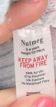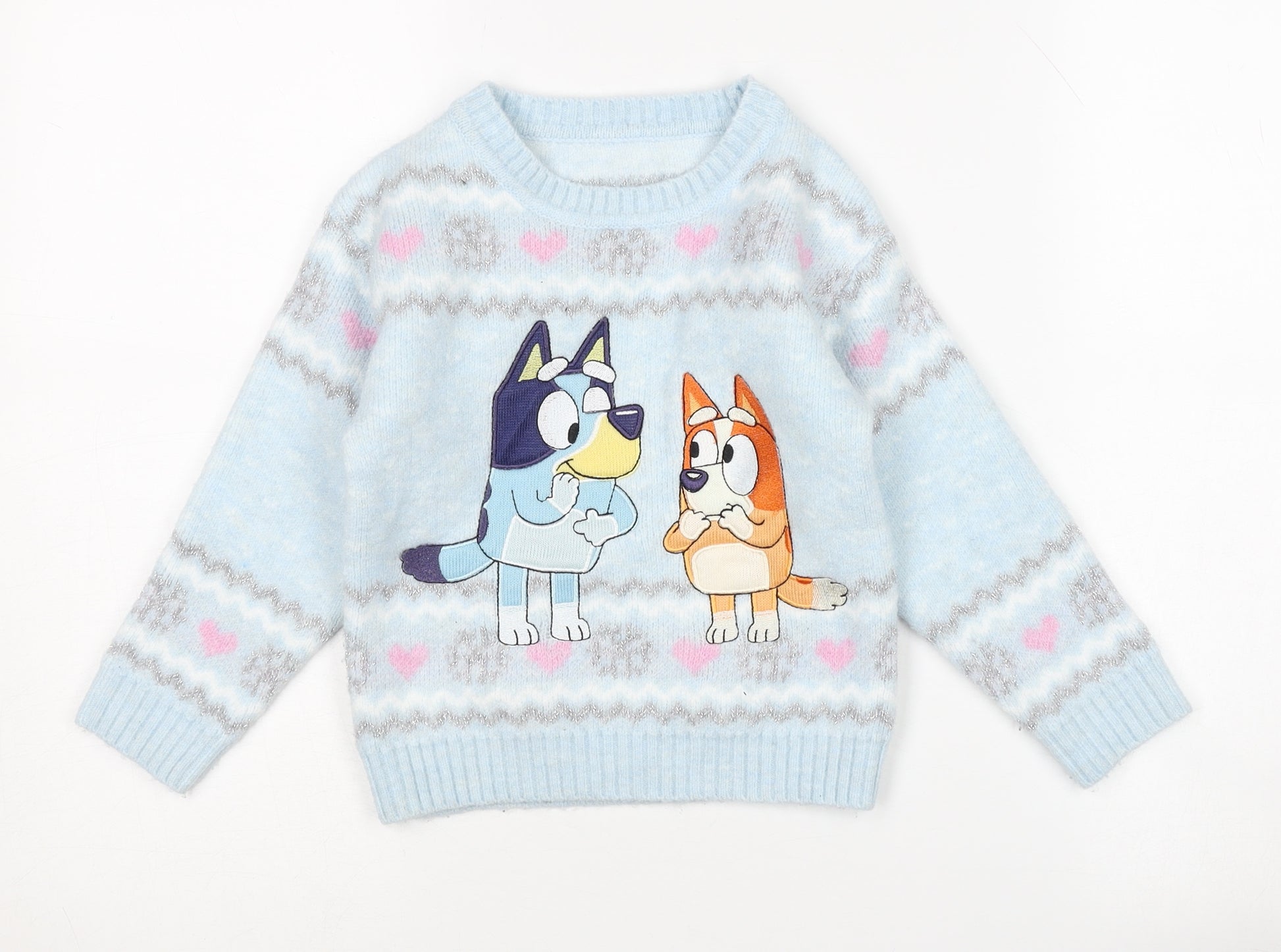 Discover the charming Nutmeg Girls Blue Cartoon Pullover Jumper, perfect for young fans of Bluey. Designed with a delightful cartoon theme, this lightweight knit jumper features beloved characters from the Bluey family, making it a delightful addition to any child's wardrobe. Crafted from a blend of acrylic, polyester, elastane, and metallic fibre, this jumper offers both comfort and style with a touch of glitter to brighten up cold winter days. The soft blue fabric showcases a Fair Isle pattern interspersed with pink hearts, creating a playful and cosy look ideal for casual outings. With a crew neckline and long sleeves, this pullover offers warmth and ease, ensuring it's a practical choice for various occasions. The jumper is machine washable, making it easy for busy parents to care for, and its excellent condition ensures it's ready to wear with no visible stains or damage. This adorable jumper promises to keep your little one both stylish and warm throughout the cooler months. A must-have for any young Bluey enthusiast, this jumper will undoubtedly become a favourite for many seasons to come.