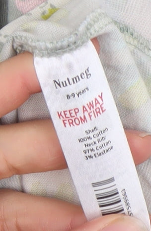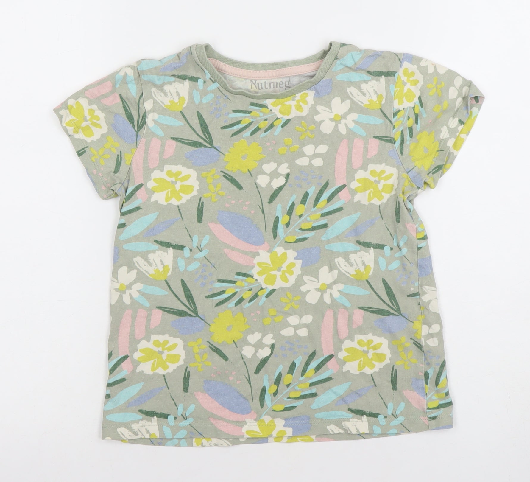 Brighten up her wardrobe with this charming multicoloured floral T-shirt from Nutmeg, perfect for everyday wear. Crafted from a soft and breathable cotton jersey fabric with a gentle touch of elastane in the neck rib for added comfort, this short-sleeve top is designed with a regular fit for carefree movement and playtime ease. The delightful floral pattern in pastel shades of yellow, pink, blue, and white against a soft base makes it a cheerful choice for every season, especially spring and summer. The classic crew neckline and pullover style ensure simple dressing, ideal for busy mornings or casual outings. Designed with lightweight and breathable cotton, it offers all-day comfort whether worn on its own in warmer weather or layered under a cardigan during cooler days. Perfect for casual occasions, school days, or trips to the park, this lovely T-shirt adds a splash of colour and joy to any outfit. Easy to care for and machine washable, it’s built for practical, everyday wear. With its excellent condition and high-quality finish, it’s a brilliant wardrobe addition for a young girl who loves bright prints and soft fabrics. Add this Nutmeg girls’ floral cotton top to her collection for a stylish yet comfortable essential that’s sure to become a favourite go-to piece.
