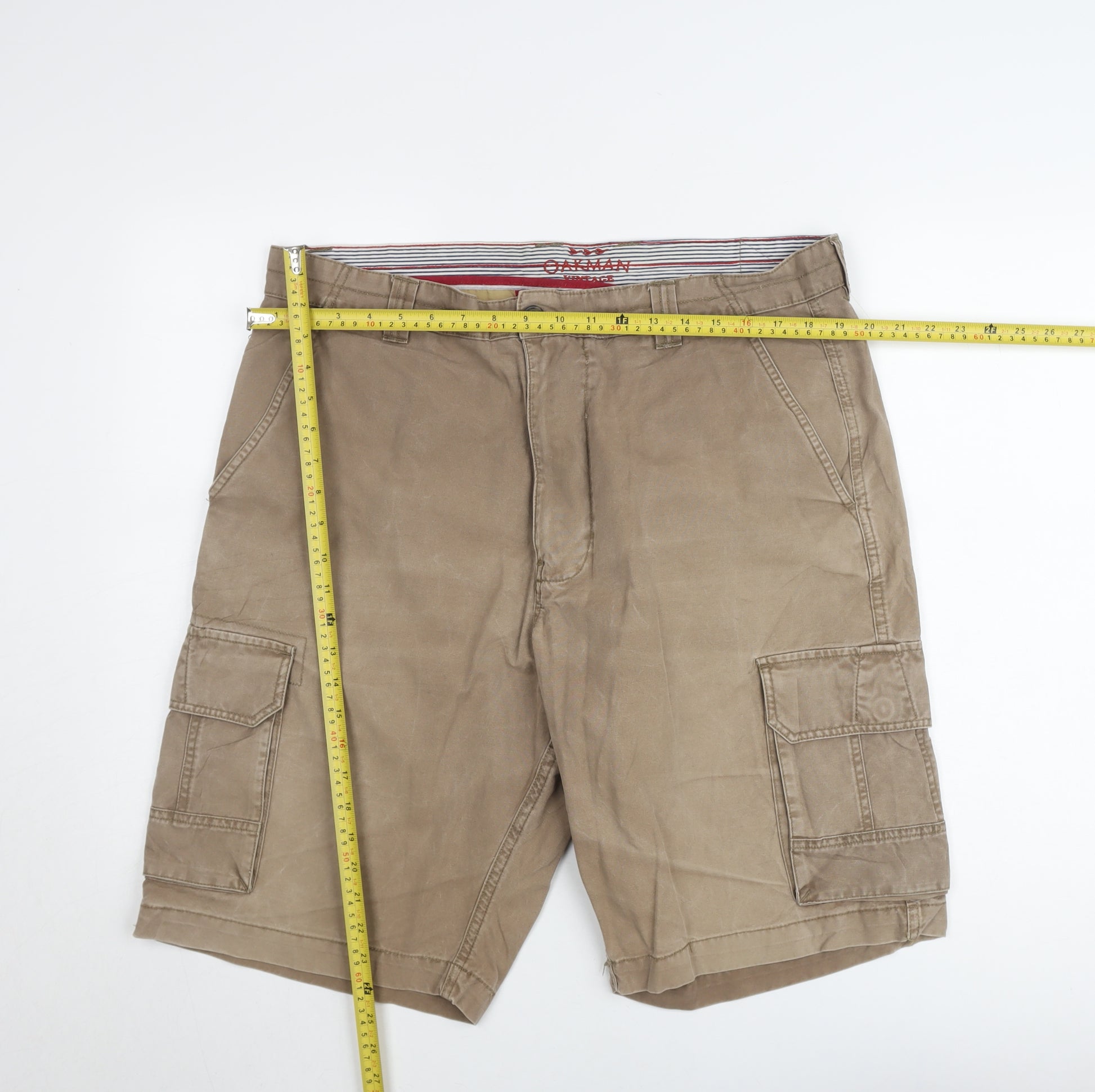 Step into effortless summer style with these vintage-inspired Oakman men’s beige cargo shorts. Designed for practicality and comfort, they feature multiple spacious cargo pockets that make them ideal for everyday wear, travel, or outdoor adventures. Crafted from pure cotton, the shorts offer breathable comfort and a durable finish, making them suitable for casual days out or relaxed holiday looks. The classic beige tone makes them highly versatile and easy to pair with anything from polos to graphic tees, offering laid-back style with a touch of rugged charm. The mid-rise waist and regular fit ensure all-day comfort, while the flat-front design gives a smart yet relaxed appeal. Secure with a zip and button fastening, the shorts combine functionality with an understated aesthetic. Subtle vintage accents, such as the Oakman signature waistband detailing and sturdy buttoned cargo pockets, add a touch of authenticity to the design. Perfect for spring and summer wear, these cargo shorts allow ease of movement whether you are exploring city streets or enjoying a beach stroll. Easy to care for with machine-washable fabric, they’re a dependable and stylish addition to any casual wardrobe. Lightly worn with no noticeable marks or damage, they remain in very good pre-owned condition and deliver excellent quality and comfort. Add these Oakman vintage cargo shorts to your collection for a timeless staple that brings effortless practicality to warm-weather styling.