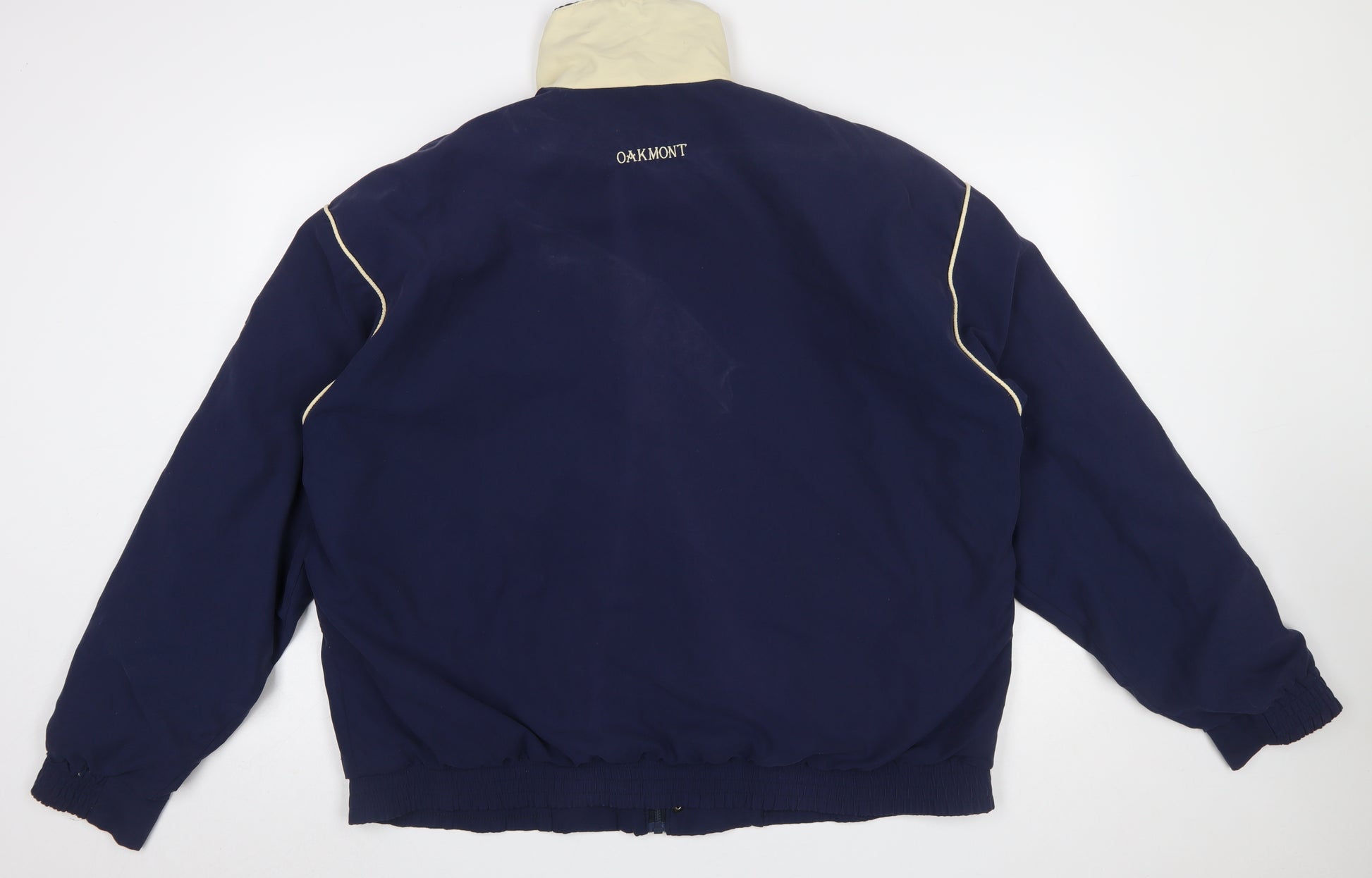 Stay effortlessly stylish and comfortable with this Oakmont men's blue bomber jacket, designed to offer reliable warmth and contemporary appeal. Crafted from durable polyester, it has a softshell outer and a smooth polyester lining for comfort and easy layering. The jacket features a classic bomber silhouette with a full zip and secure button fastening, ensuring practicality and sleek style. Its elasticated waistband and cuffs provide a tailored fit while maintaining ease of movement. The contrasting cream stand-up collar and piping details add a subtle touch of sophistication to the overall sporty design, making it ideal for both casual wear and travel. Perfect for cooler autumn and winter days, this jacket provides synthetic insulation for dependable warmth without unnecessary bulk. Whether you're heading outdoors for a weekend walk, playing a round of golf, or travelling, this Oakmont jacket ensures both comfort and performance. The mid-length cut gives good coverage, while spacious front pockets offer functionality for everyday use. Finished with Oakmont embroidery on the back and sleeve, it exudes understated branding and timeless appeal. Though pre-owned, it remains in very good condition with only light marks visible on the fabric, reflecting careful previous use. This is a versatile and dependable option for the modern man who values both practicality and smart casual aesthetics. Pair effortlessly with jeans or chinos for a laid-back, confident look that works wherever life takes you. A functional yet refined choice ideal for daily wear or relaxed outdoor pursuits.