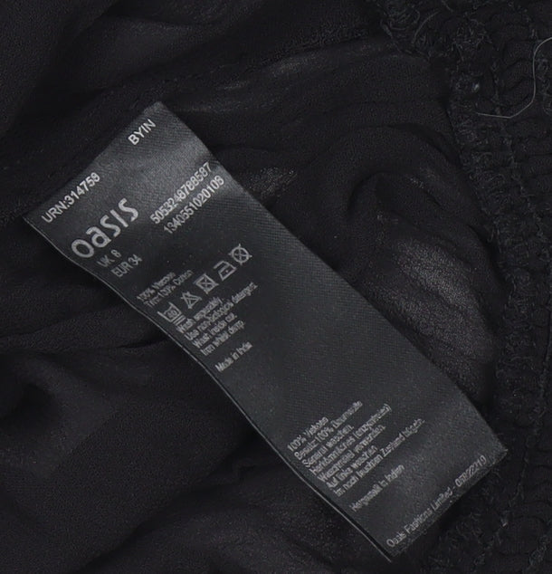 Discover the elegance of this Oasis women's blouse, tailored to enhance your wardrobe with its chic design and intricate crochet accents. Perfect for any sophisticated occasion, the blouse is crafted from 100% cotton providing a comfortable and breathable wear. Its solid black colour is a versatile addition, seamlessly blending with various outfits for day or night occasions. The long sleeves and exquisite detail on the upper section offer an added touch of elegance and style. Designed for the modern woman, this regular size blouse is an ideal choice for casual outings or making a subtle fashion statement at a more formal gathering. Appreciate the fine craftsmanship of Oasis, ensuring quality and style are paramount in every piece they create. Gently preloved, this blouse arrives in excellent condition ready to become a staple in your fashion repertoire.