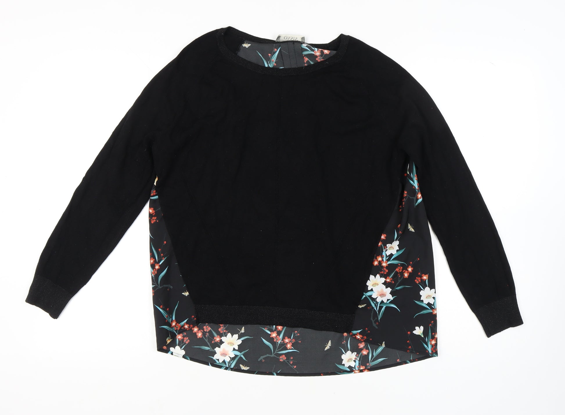 Add a touch of elegance to your wardrobe with this stylish Oasis Women's Pullover Jumper. The beautiful combination of black knit fabric and a striking floral pattern on the back makes this piece a versatile addition for the colder months of autumn and winter. Its long raglan sleeves and crew neck design ensure a comfortable fit, while the blend of viscose and polyester promises softness and durability. Perfect for casual occasions, this jumper is an easy match with jeans or a skirt for a relaxed yet chic look. Machine washable for your convenience, this jumper is sized large, fitting regular size types snugly. Whether you're heading out for a casual day or simply lounging, this piece provides both comfort and style.
