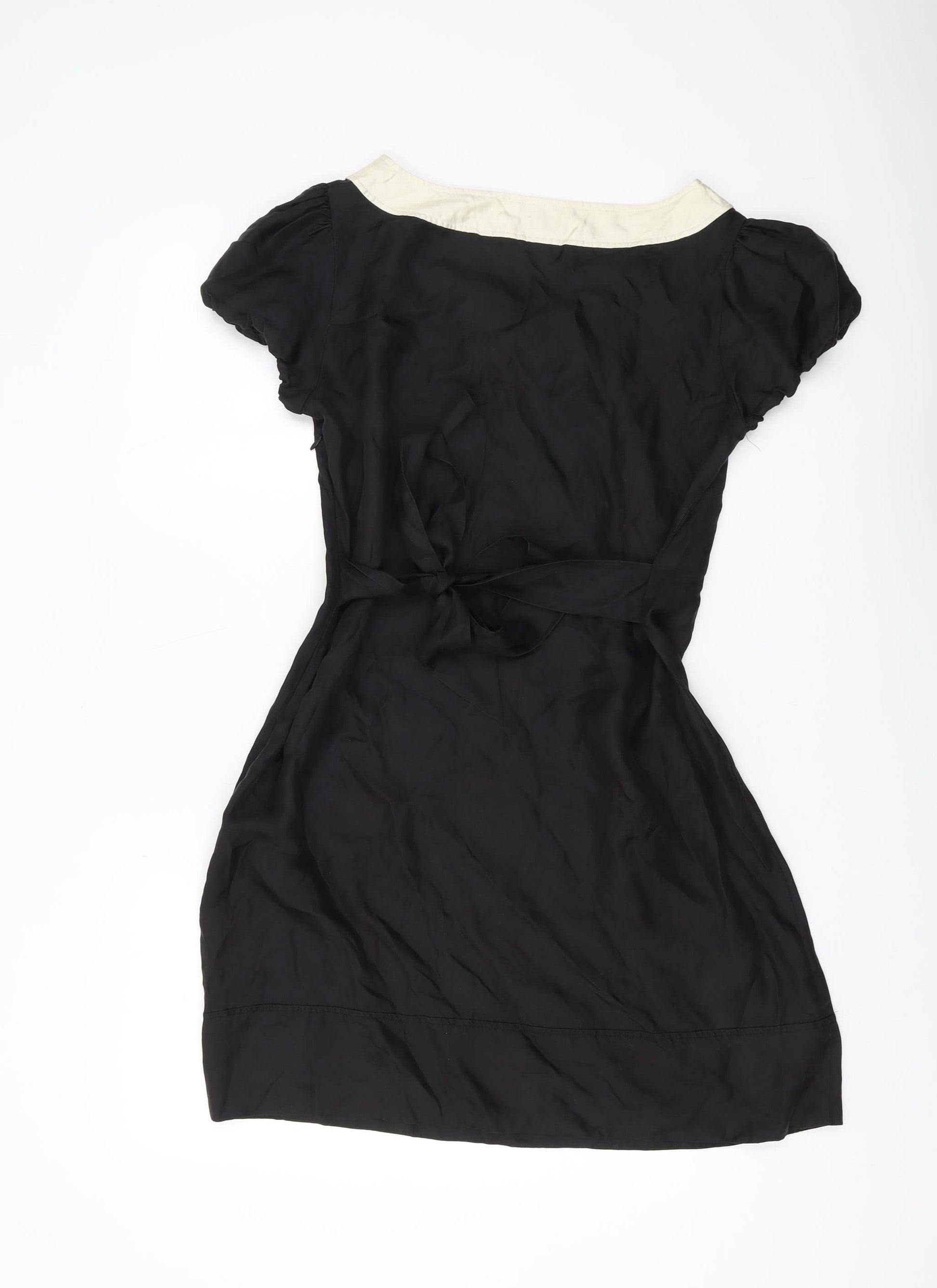 This stylish black shift dress by Oasis is an elegant addition to any wardrobe. Crafted from luxurious 100% silk, this dress is perfect for a variety of occasions, from casual outings to party evenings. The short dress length and cap sleeves give it a feminine silhouette, accentuated by a charming bow accent at the neckline. With its lightweight and breathable material, it's perfect for spring and summer seasons. The classic scoop neckline and tie closure at the back add a touch of sophistication to this versatile piece. Whether you're heading for a brunch or a cocktail party, this dress guarantees style and comfort in one ensemble. In excellent condition, it shows only slight signs of wear, ready to be a chic staple in your closet.