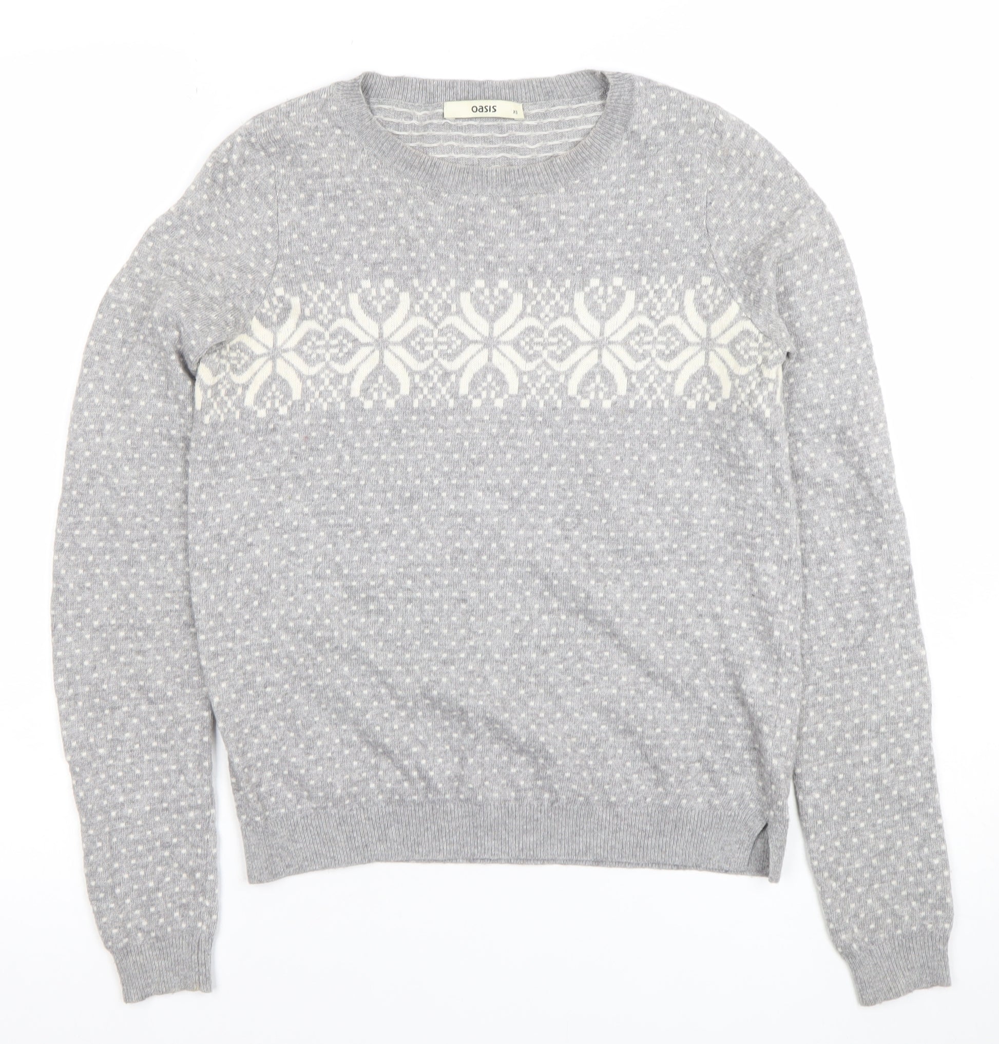 Wrap your little one in cosy winter comfort with this charming grey Fair Isle jumper from Oasis. Crafted with a detailed knitted texture, this pullover features a classic white Fair Isle design that stretches across the chest, adding a timeless wintry touch. Made from a blend of viscose, polyester, polyamide and wool, it offers a soft feel against the skin while keeping warmth locked in for those chilly days. The finely ribbed crew neckline, cuffs and hem enhance both fit and durability, ensuring it looks great wear after wear. Designed for comfort and practicality, this lightweight but insulating jumper makes an excellent choice for winter layering. Perfect for weekend outings, family gatherings or school days, it gives a stylish yet effortlessly casual look that suits any cold-weather wardrobe. The long sleeves and subtle side hem splits provide extra comfort and mobility, allowing it to layer easily over a shirt or under a coat. Although sold without original retail tags, this piece is in excellent condition with no visible signs of wear — ready for a new owner to enjoy. Easy to care for with hand washing, it remains looking fresh and soft. For added warmth and charm, this cosy Oasis Fair Isle knit will become a go-to piece that pairs wonderfully with jeans, cord trousers or skirts. Ideal for wintertime adventures and casual wear alike, it’s a versatile and enduring classic that captures simple seasonal style beautifully.