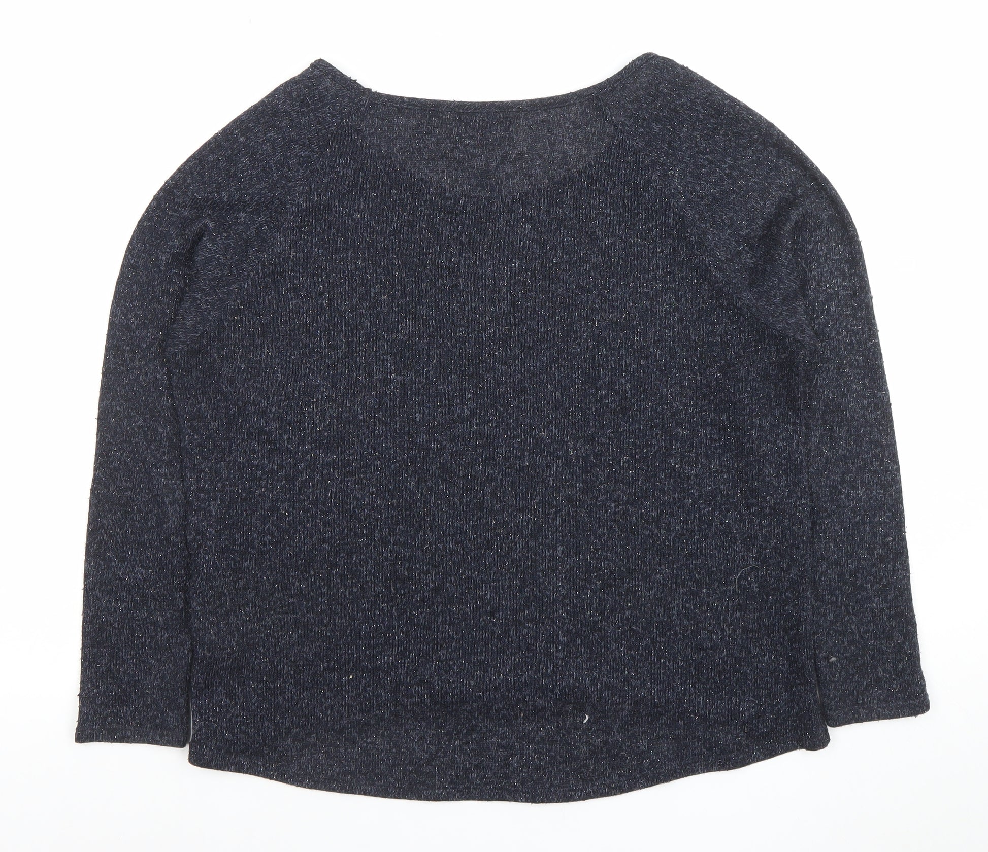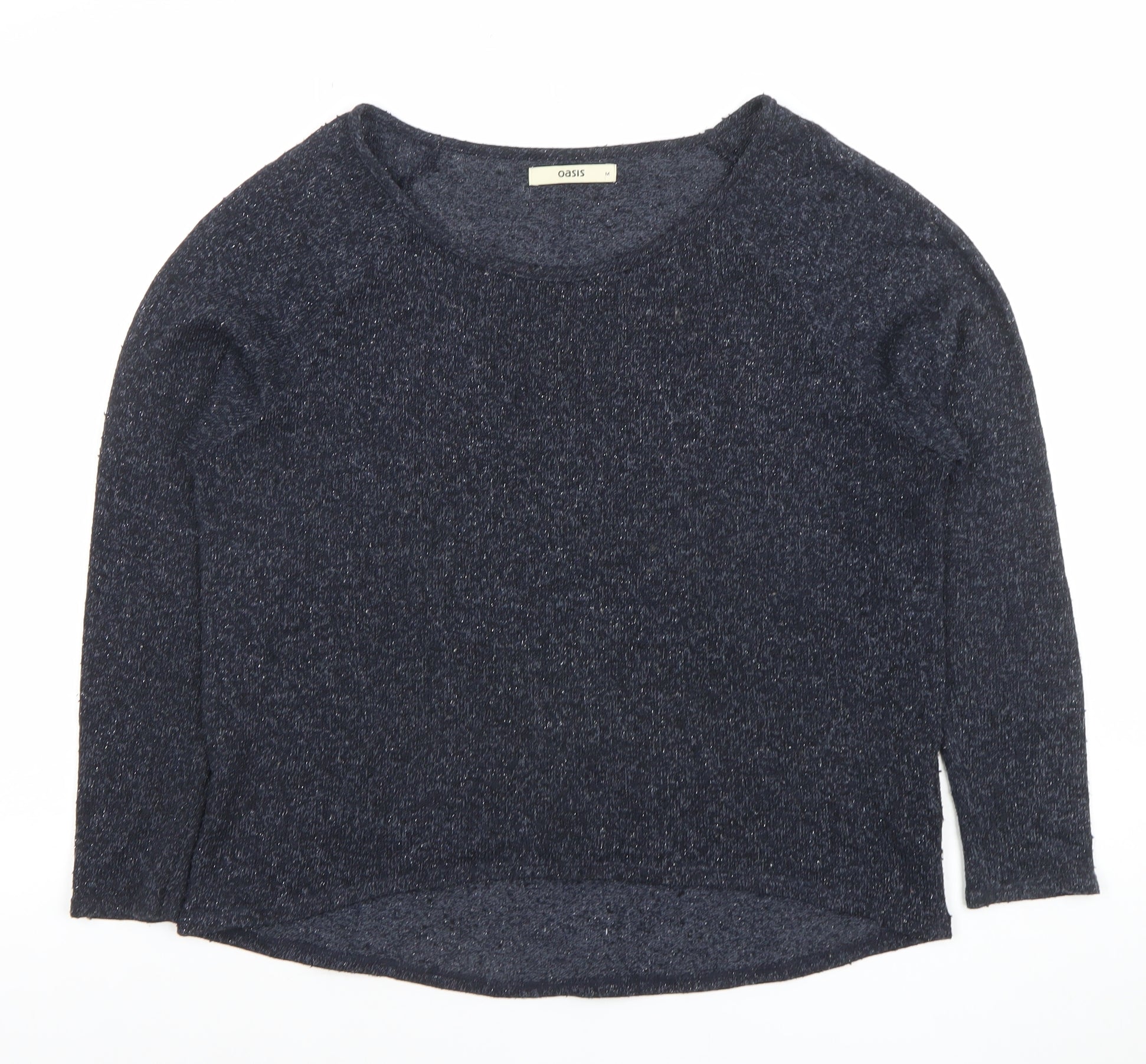 This Oasis women's blue knit pullover is the perfect addition to your wardrobe, ideal for layering through the cooler seasons. Crafted in a soft and comfortable blend of acrylic, polyester, and metallic fibre, the jumper brings subtle shimmer and warmth without sacrificing comfort. Designed with a simple round neckline and flattering 3/4 sleeves, it offers effortless style that works equally well for casual outings or relaxed office looks. The lightweight, tightly-knit fabric gives it a fine structure, making it a versatile piece that pairs perfectly with jeans, skirts, or tailored trousers. The neat fit in a size M ensures a flattering silhouette suitable for most regular builds. Its dark blue tone lends itself beautifully to both neutral and colourful pairings, easily taking your look from daytime casual to evening chic. Made to be practical as well as stylish, this machine-washable jumper ensures easy care and durability, allowing for long-lasting wear. Ideal for autumn and winter, it’s an easy wardrobe staple that complements a variety of styles. Subtle metallic detailing woven throughout adds a touch of understated glamour, making it a great choice for casual evenings out or adding sparkle to everyday wear. The lightweight design means it’s perfectly suited for layering under jackets or over shirts. Condition is excellent with only slight signs of wear, showing this quality Oasis piece has been carefully maintained and has plenty of life left. With its minimalist yet sophisticated design, this jumper is sure to become your go-to piece for effortless, modern style. Whether you’re running errands, working from home, or enjoying a relaxed lunch with friends, this Oasis blue knit pullover makes dressing simple, stylish, and comfortable—everything a reliable, chic knit should be.