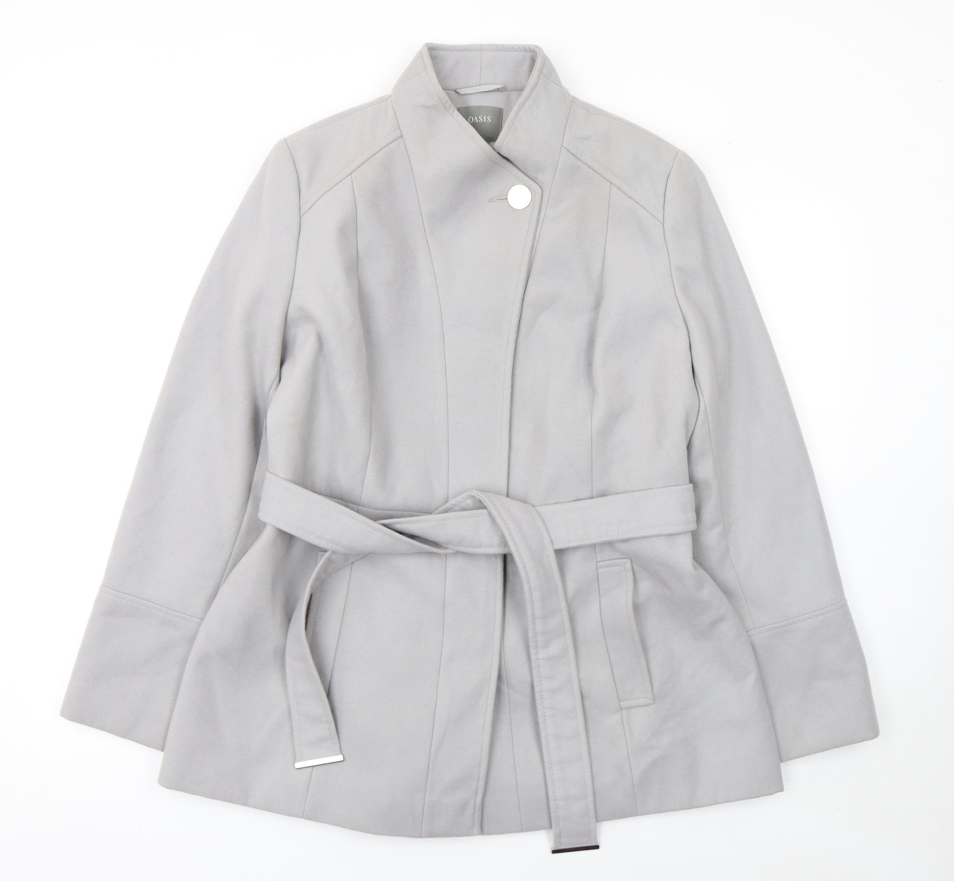 Elevate your outerwear collection with this sophisticated Oasis women’s short coat in a versatile grey shade. Beautifully tailored for a flattering silhouette, this coat features a belted waist that creates a refined, feminine shape. Crafted from a soft, durable blend of polyester, viscose and elastane, it combines comfort with resilience, making it an ideal choice for everyday elegance in cooler seasons. The interior is fully lined in smooth polyester, ensuring a polished finish and added warmth. Thoughtfully designed with a high collar, sleek seams and minimal detailing, this coat offers a timeless appeal suitable for business, casual or smart-casual wear. The practical front pockets add functionality, while the single-button front closure and matching belt keep the style streamlined and modern. Perfect for pairing with tailored trousers, dresses or jeans, it transitions effortlessly from workdays to weekends. Its neutral grey tone complements a wide range of outfits, making it a truly versatile wardrobe piece. With its structured yet comfortable fit, the Oasis Short Coat embodies modern sophistication with classic appeal. This item is pre-owned and remains in very good condition, showing minor signs of wear such as a light mark at the shoulder. Offering quality craftsmanship and chic everyday style at an affordable price, this coat is excellent value for anyone seeking a go-to outerwear option for autumn, winter and spring. Add effortless class to your look with this stylish Oasis belted coat — a perfect mix of comfort, confidence and contemporary design.