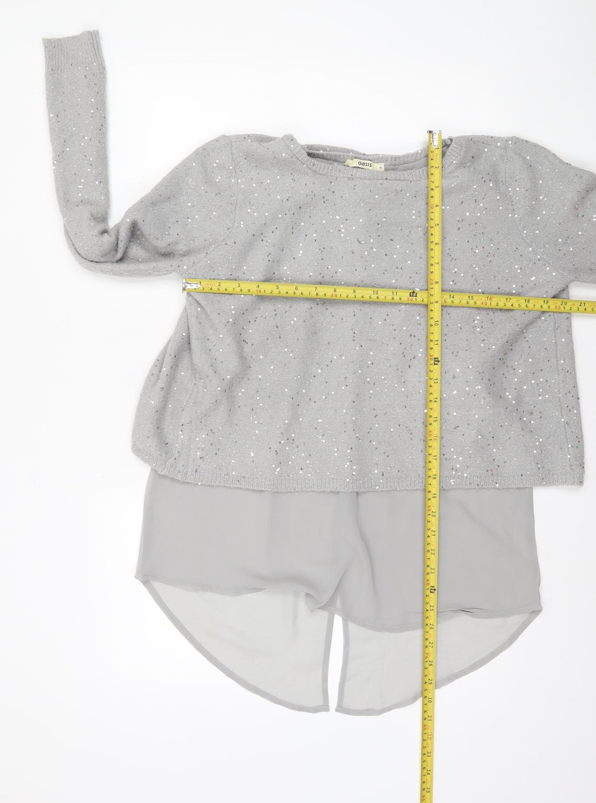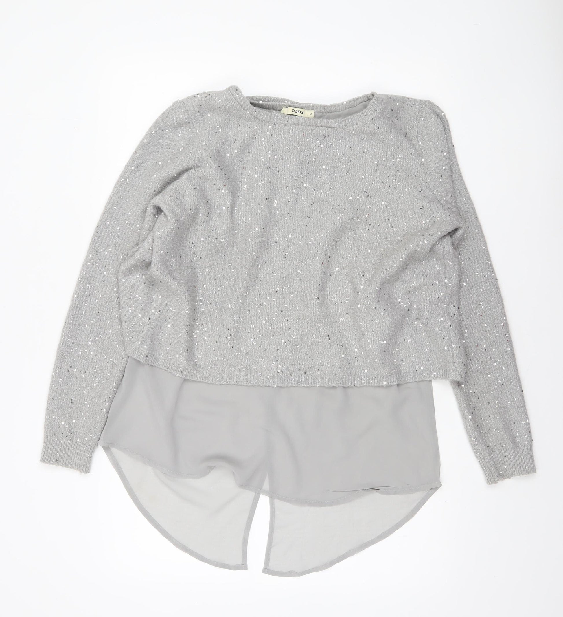 Step out in style with this shimmering grey layered jumper from Oasis, a perfect blend of casual elegance and subtle glamour. Crafted from a soft knit fabric with a touch of stretch, this women’s pullover features a flattering regular fit and a relaxed silhouette that transitions effortlessly from day to night. The upper portion of the jumper is embellished with delicate sequins, giving it a sparkle that catches the light beautifully without being overpowering. Beneath the soft knit, the lightweight chiffon-look underlayer adds graceful movement and a feminine touch, creating a sophisticated layered effect. Designed with a classic crew neckline and long sleeves, this Oasis jumper offers both comfort and versatility. The acrylic and polyamide blend ensures a cosy feel, while the metallised fibre provides that extra shine perfect for festive gatherings or an evening out. Whether paired with jeans for an effortlessly chic everyday look or dressed up with tailored trousers for a more polished ensemble, this piece works across occasions. Ideal for autumn and winter, it provides warmth while maintaining an airy elegance. The sequin accents make it a go‑to choice for parties or casual nights out where a bit of sparkle is welcome. In excellent pre-owned condition, this garment shows very light signs of wear with no damage. Loved for its quality and modern design, this Oasis grey layered jumper is a versatile addition to any wardrobe, offering lasting style and comfort. A flattering choice for women who appreciate knitwear that’s both cosy and chic, it’s sure to become a seasonal favourite. Don’t miss the opportunity to add this effortlessly stylish piece to your collection — perfect for layering and ready to make a subtle statement wherever you go.