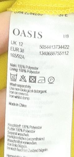 Brighten up your wardrobe with this stunning yellow blouse from Oasis, designed for women who love effortless style with a pop of colour. Crafted from soft, lightweight woven polyester, this top offers both comfort and elegance, making it a versatile option for work, casual outings, or seasonal get-togethers. The vibrant yellow hue instantly lifts your look, while the flattering V-neckline adds a touch of femininity and sophistication. With a regular fit and classic short sleeves, it provides easy movement and a polished silhouette that works beautifully when styled under blazers or paired with jeans, skirts, or tailored trousers. The pullover design ensures fuss-free wear, and its breathable material makes it ideal for warmer seasons like spring and summer. This Oasis blouse retains its lovely shape and colour wash after wash, thanks to its durable 100% polyester composition. The top’s simplicity and solid colour make it easy to accessorise—whether you go bold with statement jewellery or keep it minimalist for classic refinement. Perfect for casual days, office settings, or relaxed weekends, it’s a wardrobe staple that transitions seamlessly from day to night. The item remains in excellent condition with no visible signs of wear or damage, ensuring it’s ready to be worn and enjoyed immediately. If you’re after an affordable yet high-quality top that combines comfort, durability, and timeless appeal, this Oasis yellow V-neck blouse is the perfect fit. Machine washable for easy care, it’s the go-to piece for those who value low-maintenance elegance. Add a splash of sunshine and confidence to your outfits with this cheerful and beautifully tailored top — it’s sure to become one of your favourites for seasons to come.