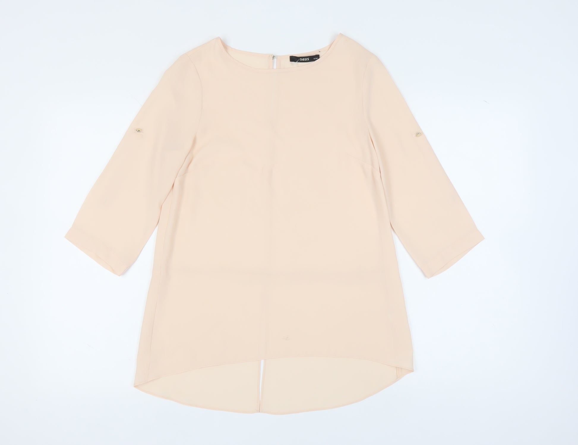 This chic Oasis blouse in a flattering beige tone is perfect for the modern woman looking for style and simplicity. Crafted with a comfortable regular fit, this top features a graceful boat neckline and trendy 3/4 sleeves, making it ideal for versatile, everyday wear. The zip closure provides ease of use, adding to the practicality of this staple piece. Whether you're heading to a casual meeting or a weekend brunch, this elegant blouse fits the bill perfectly. Pair it with tailored trousers or your favourite jeans for an effortlessly stylish look. Despite being in very good condition, a slight mark on the back adds character to this timeless piece. Don't miss out on adding this versatile item to your wardrobe at an irresistible price.