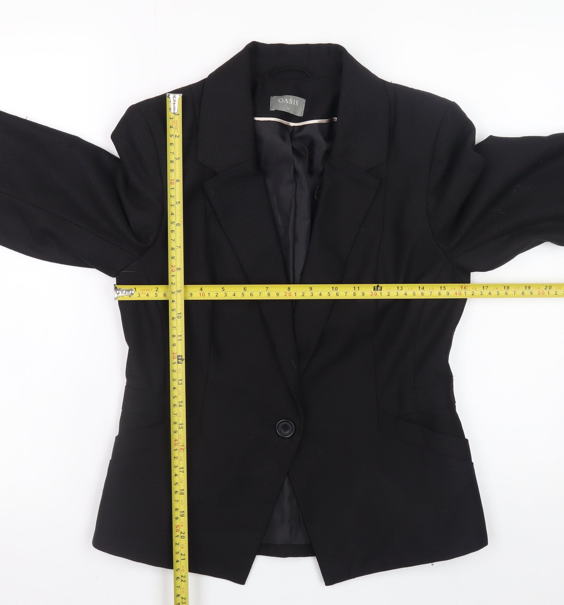 Elevate your everyday workwear with this beautifully tailored black blazer from Oasis. Designed for the modern woman seeking both style and confidence, this structured jacket is crafted in a soft yet durable blend of polyester, viscose, and elastane for a comfortable fit that moves with you. With its clean silhouette and classic design, this piece features a single-breasted front with a single-button closure, creating a refined and professional finish suitable for business, formal, or smart-casual occasions. The short-length cut enhances a flattering shape while the smooth polyester lining ensures a sleek feel against the skin, providing both comfort and a polished appearance throughout the day.Practical as well as elegant, this blazer includes light padding at the shoulders to maintain its crisp structure and a sharp lapel collar for a timeless touch. Its regular fit and quality craftsmanship allow for effortless layering over blouses, shirts, or dresses, while the subtle darting gives a contoured finish that flatters the waist. The versatile black colour makes it easy to coordinate with a wide range of outfits, from work ensembles to evening wear.Made with a refined twill-like weave, this Oasis piece offers durability and smooth drape, making it ideal for year-round wear through autumn, spring, and winter seasons. The jacket has been kept in excellent condition, showing only minimal signs of previous wear, ensuring it remains ready to wear straight away. Pair it with tailored trousers or a pencil skirt for a classic office look, or wear it over jeans for a chic off-duty style. Elegant, comfortable, and reliable, this black Oasis blazer is a wardrobe essential for the discerning woman who values both quality and effortless sophistication.