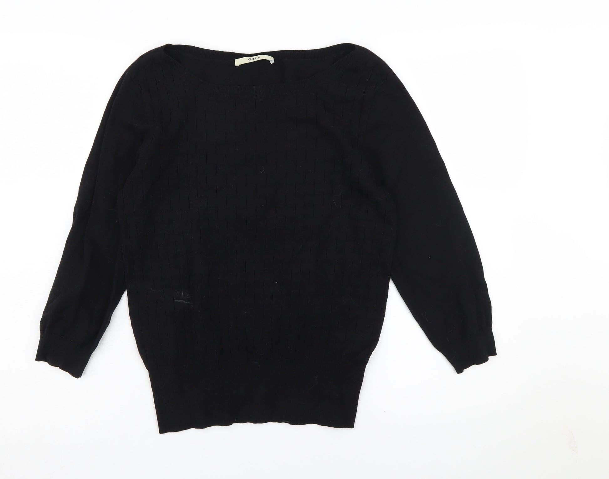 Elevate your wardrobe with this chic black pullover jumper from Oasis, designed for women who appreciate both comfort and style. Crafted from a soft blend of cotton and polyamide, this lightweight knit ensures maximum comfort. Featuring a modern boat neckline and long sleeves, it provides a sleek silhouette ideal for casual outings or layering during the cooler months of autumn and winter. The classic black colour adds a versatile touch, allowing it to blend seamlessly with any outfit, whether you're dressing up for work or keeping it casual. This jumper is machine washable for easy care, making it a practical addition to any collection. The size L caters to a regular fit, ensuring it flatters a range of body types. Despite being in gently used condition, it remains in very good shape with only slight wear, making it a great value choice. Don’t miss the opportunity to own a versatile piece that promises to enhance your seasonal wardrobe effortlessly.
