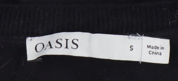 Elevate your everyday wardrobe with this stylish Oasis women’s black embroidered pullover jumper in size S. Beautifully crafted to blend comfort and elegance, this jumper is the perfect piece to take you effortlessly through the seasons. Made from a high-quality material mix of 53% viscose, 28% polyester, and 19% polyamide, the knit provides a soft, breathable, and durable feel while maintaining a flattering and flexible fit. Its lightweight but warm design makes it suitable for layering in autumn and winter, as well as wearing solo in the cooler spring months.The jumper features a classic crew neckline, ensuring timeless appeal, while the slim long sleeves give an elegant silhouette. Its standout detail is the gorgeous embroidered floral design across the shoulder and upper sleeve, adding a striking touch of femininity and charm to an otherwise versatile black base. Perfect for both casual wear and relaxed smart styling, this piece can easily be dressed up with tailored trousers or styled more casually with jeans.The tight-knit structure provides a shape-retaining fit without feeling restrictive, while the embroidery accents elevate it above the ordinary. Wear it for workwear, casual meet-ups, or laid-back evenings out—it’s an endlessly versatile addition to any modern wardrobe. A machine washable garment, it also offers easy care for everyday wear.In very good pre-owned condition, this jumper shows only light bobbling and minor lint, which does not detract from its stylish appeal or wearability. If you’re after a knitwear piece that’s chic, chic but also comfortable, this Oasis jumper makes for the perfect choice. Affordable, stylish, and effortlessly wearable, it’s an essential item for anyone looking to revitalise their knitwear rotations with a floral feminine twist.