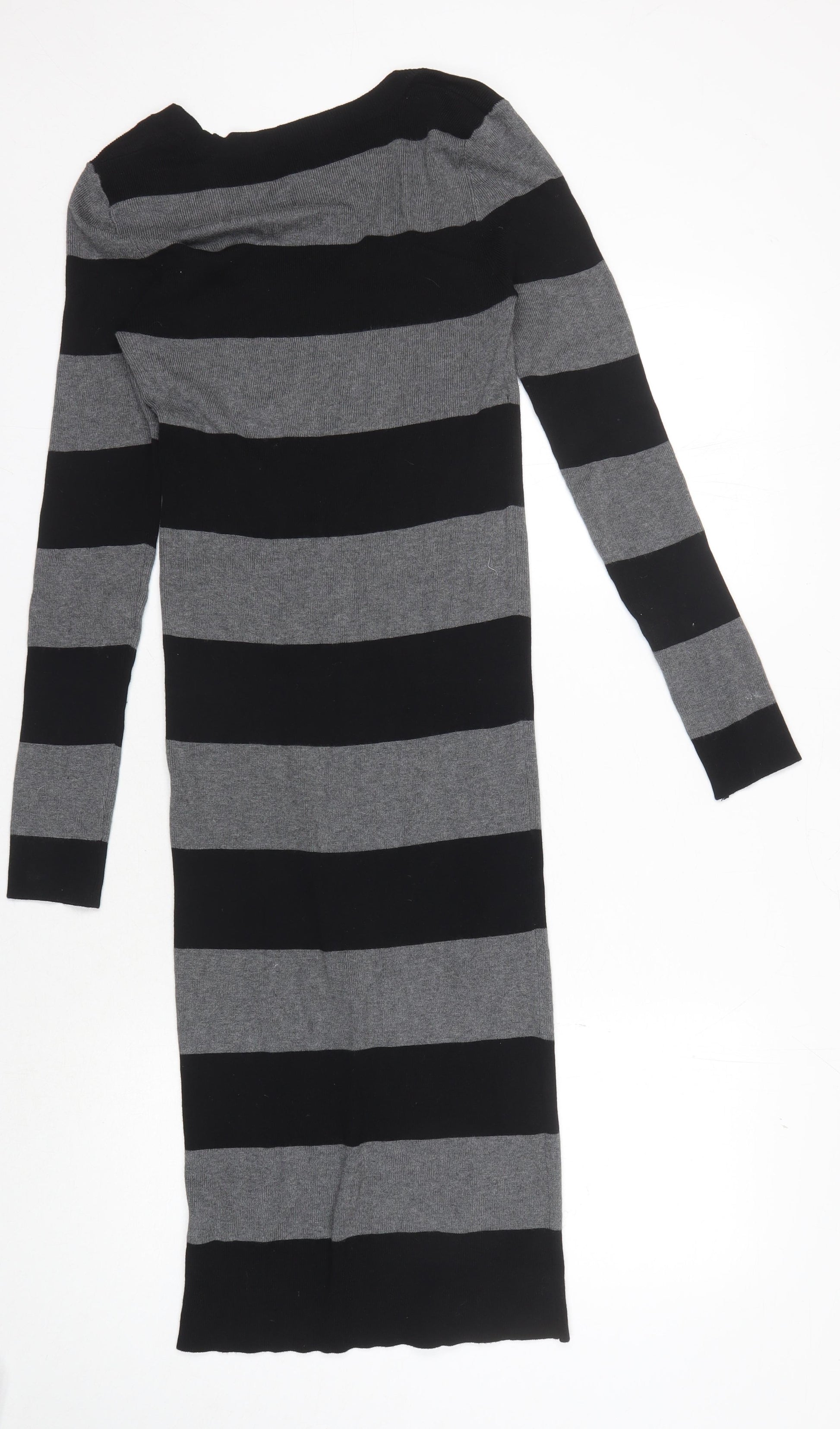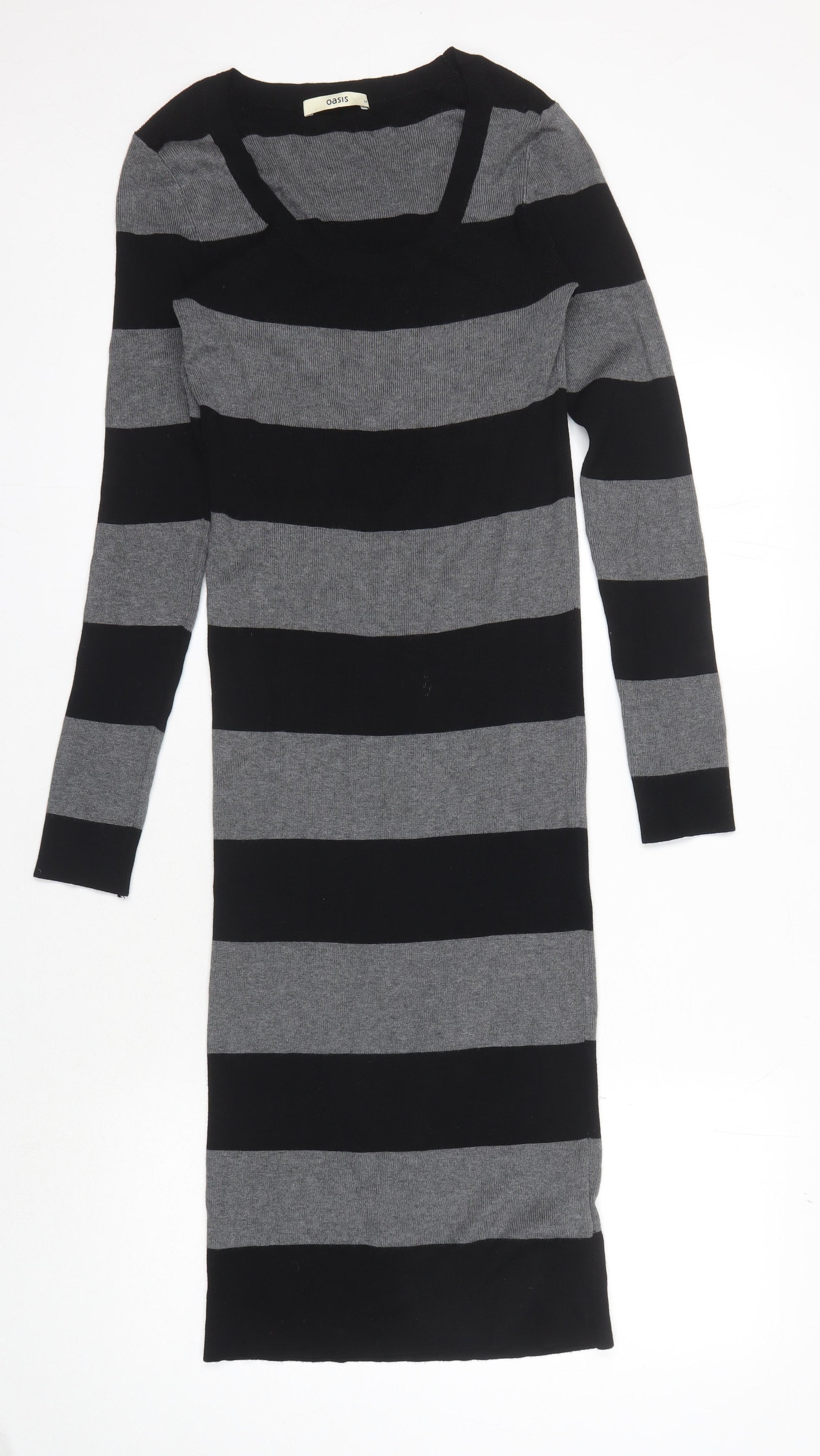 This stylish Oasis women's dress is a must-have for your wardrobe. Featuring a striking black and grey striped pattern, it embodies a chic and modern look. The dress is crafted from a comfortable knit fabric with a blend of 81% viscose and 19% polyamide, ensuring a soft and stretchy fit. Ideal for both casual and dressy occasions, its long sleeves provide coverage and sophistication, while the round neckline flatters the silhouette. Perfect for transitioning seasons, you can pair this versatile piece with your favourite shoes and accessories to create an effortlessly fashionable outfit. In excellent pre-owned condition, it's ready to make a statement in your collection.