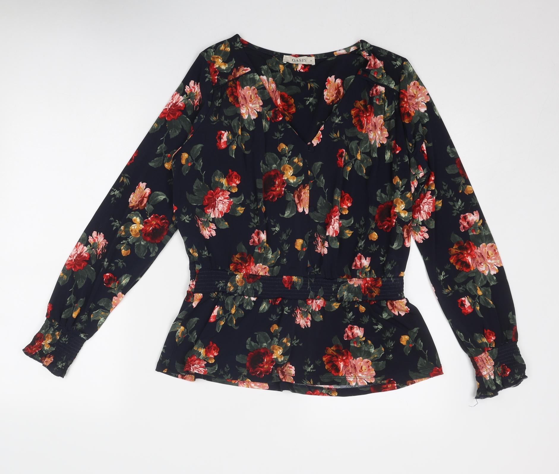 Womens Blue Floral Polyester Basic Blouse Size M V-Neck
