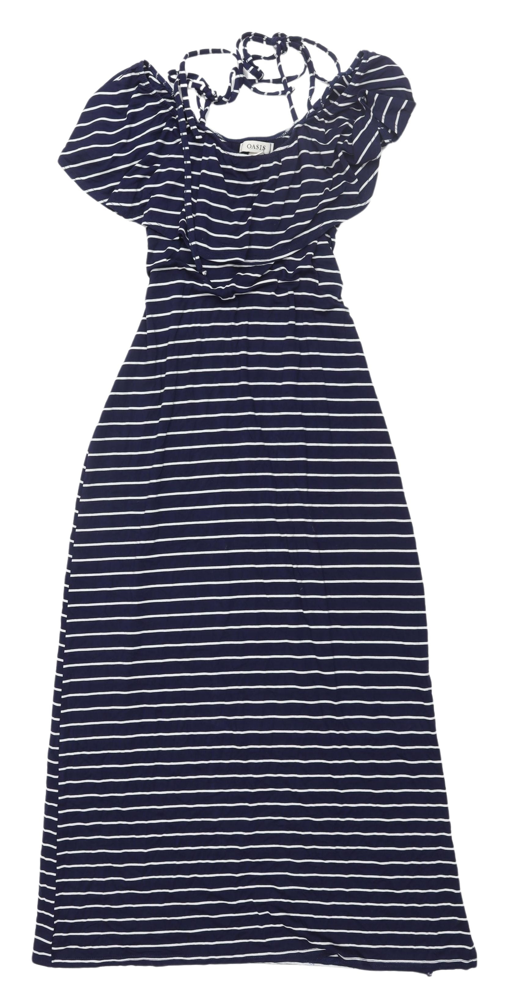 Discover effortless style with the Oasis Women's Blue Striped Maxi Dress. This stunning piece is designed for the modern woman who loves comfort without compromising on elegance. Crafted from a blend of luxurious materials, including 79% Viscose, 17% Polyester, and 4% Elastane, this dress offers a flattering fit and superb stretch for all-day comfort. The classic blue and white striped pattern adds a timeless touch to your summer wardrobe, perfect for casual outings or relaxed beach days. Featuring a long, flowing silhouette, this maxi dress embraces a chic off-the-shoulder neckline supported by delicate strappy sleeves that will accentuate your summer glow. Designed with a pullover closure, this dress is as easy to wear as it is stylish. Its lightweight jersey fabric ensures you stay cool and comfortable in the warmest weather. Ideal for a casual setting, this versatile dress offers a fresh and fashionable look for any occasion. Easy to care for with a machine washable design, the Oasis Maxi Dress is a must-have addition to any woman's wardrobe. Pair with your favourite sandals and a wide-brim hat for a complete summer ensemble.