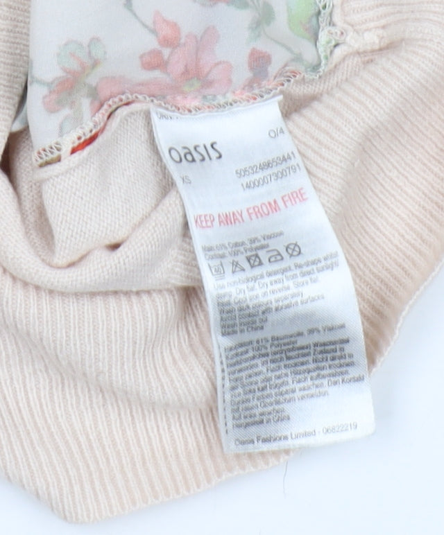 Step into casual elegance with this delightful Oasis floral pullover jumper, perfect for revamping your wardrobe for the spring and summer seasons. Crafted from a soft blend of cotton and viscose, this charming piece offers a comfortable, lightweight feel. The multicoloured floral pattern adds a vibrant touch, making it an ideal choice for everyday wear or a laid-back outing. The round neck and long sleeves create a classic silhouette, ensuring versatility and style. Accommodating a regular fit, this women's jumper caters to a variety of occasions, effortlessly transitioning from day to evening. With its tight-knit jersey fabric, this pullover promises durability and comfort. Machine washable for easy care, it's designed to become a favourite staple in your wardrobe. Complement your casual ensembles with this lovely Oasis jumper and embrace a fresh, floral look.