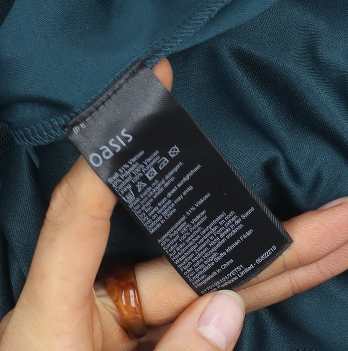 This elegant Oasis dress is perfect for any occasion. Crafted in a beautiful green hue, the dress features a classic round neckline and long sleeves, making it an ideal choice for both work and evening wear. The knit fabric ensures a comfortable fit, while the viscose and nylon blend provides a flattering silhouette. In excellent condition with no visible flaws, this dress is a versatile addition to your wardrobe. Whether you're dressing up for a special event or keeping it casual, this dress will make you feel confident and stylish.