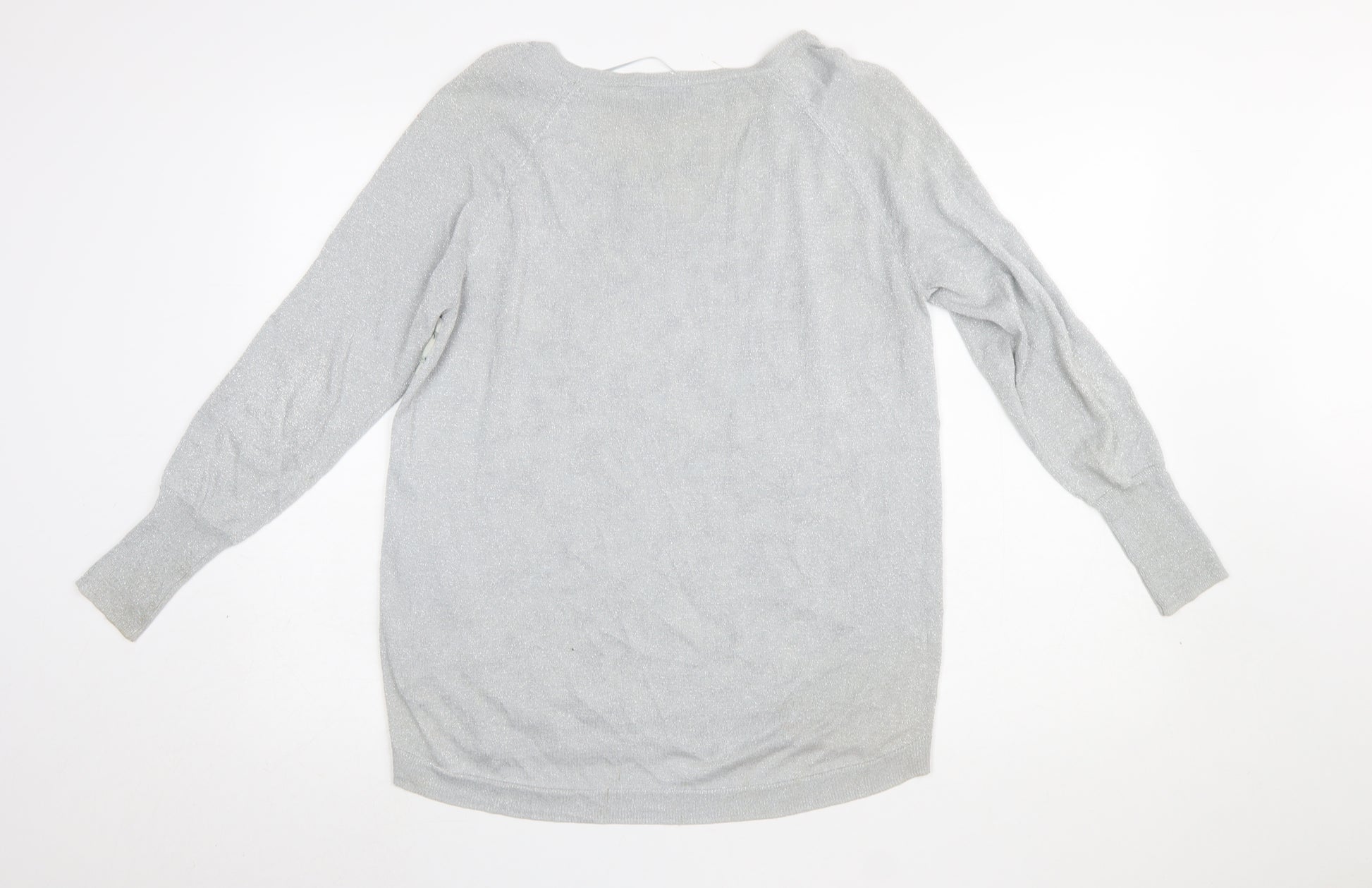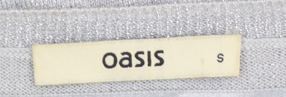 This elegant Oasis women's grey pullover jumper brings together comfort and style in one easy-to-wear design. Created for a modern, casual wardrobe, it features a subtle metallic shimmer throughout the knit body, enhanced with a beautiful floral printed front panel that adds a feminine touch. The crew neckline and raglan long sleeves ensure a flattering silhouette, making it perfect for transitioning between seasons. Crafted from a soft blend of viscose, polyester, and metallised fibres, the jumper offers a gentle stretch and lightweight feel, allowing it to be both breathable and comfortable for everyday wear. The fabric also drapes naturally, creating a relaxed yet refined fit that’s ideal for layering. This Oasis jumper is perfect for both casual outings and semi-formal gatherings — pair it easily with jeans, leggings, or skirts for versatile styling options. The grey colour palette and metallic threads make it an excellent choice for those who appreciate understated glamour. With an overall excellent pre-loved condition and no visible flaws, it has been carefully checked to uphold quality standards. Designed for women who love timeless pieces with a hint of sparkle, this piece delivers effortless sophistication. A floral motif theme adds charm without overpowering the subtle shine of the soft fabric. Whether you're dressing for a winter coffee date, a day at the office, or a cosy evening at home, this Oasis knit jumper will provide a stylish edge to your wardrobe. Add this beautiful and versatile garment to your collection for a touch of elegance and comfort that blends classic textures with contemporary detail. A must-have piece for transitional seasons like spring and autumn, while still warm enough for layering in winter.