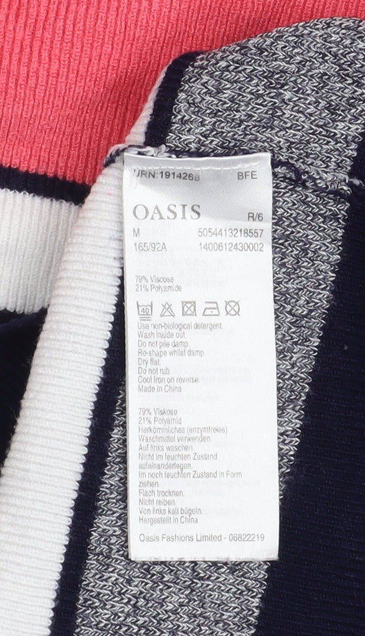 Add effortless style and sophistication to your wardrobe with this Oasis women's multicoloured striped jumper. Crafted from a soft and lightweight blend of viscose and polyamide, this jumper feels smooth against the skin while providing a flattering fit that’s perfect for everyday wear. The boat neckline offers a chic and feminine touch, creating a versatile piece that pairs beautifully with jeans, skirts, or tailored trousers. Designed in a charming combination of coral pink, ivory, navy, and grey horizontal stripes, this piece brings a playful yet polished feel to casual dressing.Featuring long sleeves and a tight-knit texture, it’s ideal for layering on cooler spring or autumn days. The medium weight and breathable knit construction ensure comfort and ease of movement whether you're out for lunch or relaxing at home. The high-quality fabric keeps its shape while maintaining a soft hand feel, showcasing Oasis' attention to detail and commitment to durable fashion.This jumper, in a regular fit, offers a flattering silhouette that drapes nicely without feeling restrictive. It’s machine washable for practical everyday care, making it a stylish, low-maintenance wardrobe essential. The simple striped design enhances its timeless appeal while adding just enough colour to make it stand out from standard basics.In excellent used condition with minimal signs of wear, this jumper maintains its quality and freshness. Perfect for creating a smart-casual look, it can easily be dressed up with a statement necklace or dressed down with denim for an understated outfit. Whether you’re heading to the office, a weekend outing, or a relaxed meet-up with friends, this Oasis jumper ensures you’ll look effortlessly put-together and stylish while staying comfortable. A must-have piece for modern women seeking a balance of comfort, quality, and timeless design.
