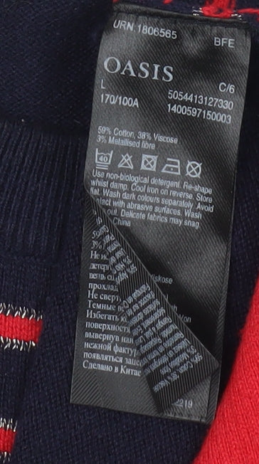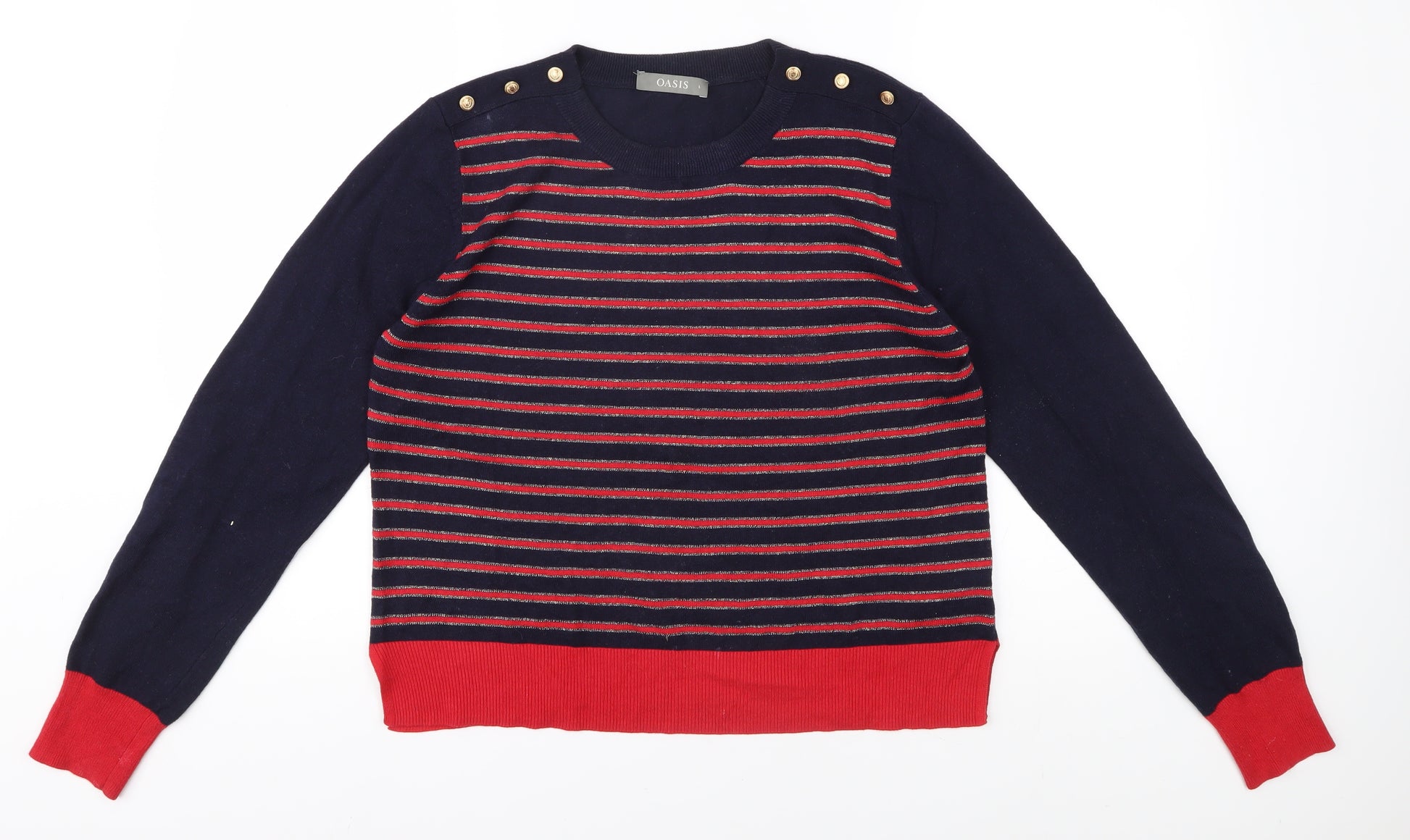 Discover casual elegance with this Oasis women's pullover jumper, perfect for your autumn and winter wardrobe. Crafted from a blend of soft cotton and lightweight viscose, it offers comfort and style in one. The jumper is multicoloured, featuring a sophisticated navy base complemented by vibrant red stripes, making it a versatile addition to any wardrobe. Its regular fit and long sleeves provide a classic silhouette, enhanced by its crew neckline for a timeless appeal. Accented with stylish gold buttons on the shoulders, this piece combines functionality and fashionable flair. Whether layered over a shirt or paired with your favourite jeans, it ensures a chic look for any casual occasion. Machine washable for easy care, it's an essential piece to stay stylishly snug throughout the seasons.