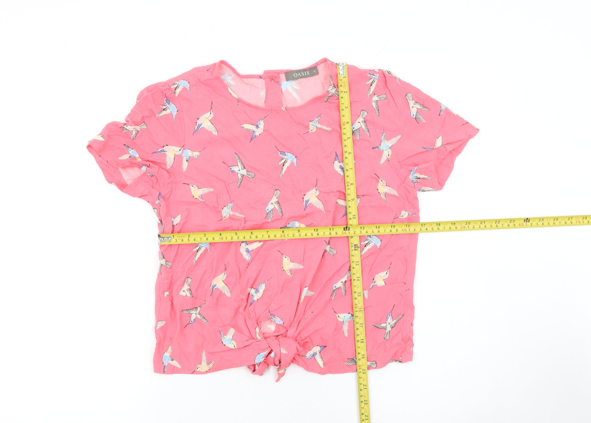 Brighten your wardrobe with this delightful Oasis women's pink blouse featuring a charming all-over bird print. Designed to bring a touch of playful elegance, this short sleeve blouse is perfect for casual days or relaxed weekend outings. Crafted from a lightweight 100% viscose fabric, it offers a soft, breathable feel that's ideal for keeping comfortable throughout the warmer seasons. The cropped cut with a front tie detail creates a flattering, modern silhouette while adding a feminine touch. The crew neckline keeps the look classic and wearable, and the button fastening at the back provides both ease and style. The lively pink shade, paired with the colourful bird pattern, makes it easy to pair this top with jeans, shorts, or skirts for a versatile and fashionable outfit. This Oasis blouse exudes cheerful spring and summer vibes, perfect for adding colour and energy to your everyday wardrobe. Whether worn tucked into high-waisted trousers or left loose for a relaxed look, it strikes a balance between chic and effortless. The blouse remains in very good condition with only minor creasing visible, ensuring it’s ready to wear straight away. Ideal for casual wear, coffee catch-ups, or holiday strolls, this Oasis top captures fun sophistication with every wear. Make it your go-to piece for uplifting, easygoing style infused with personality and comfort.