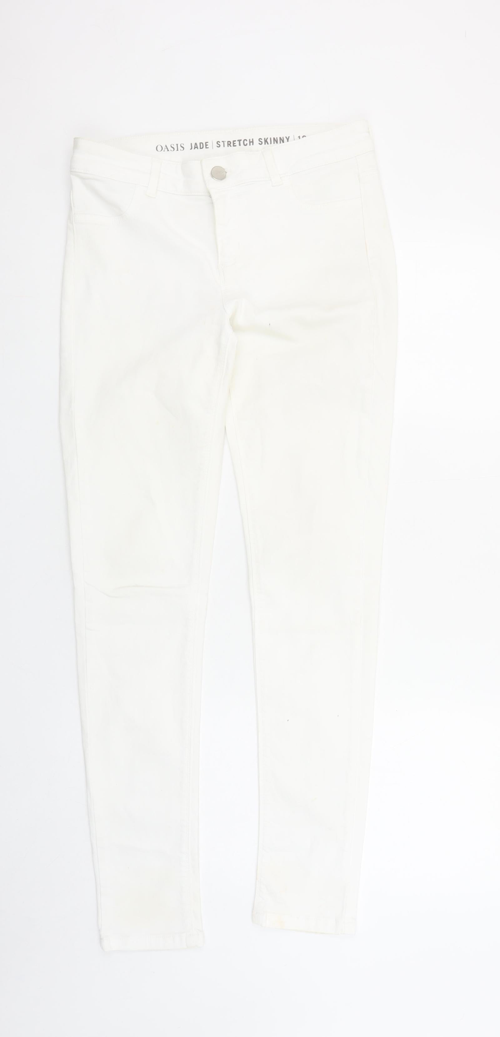 Step into effortless style and classic comfort with these Oasis Women's White Jade Stretch Skinny Jeans in UK Size 12. Designed for the modern woman, these jeans feature a flattering slim fit silhouette that hugs the body beautifully while allowing free movement thanks to the added stretch. Crafted from a soft blend of cotton, viscose, polyester, and elastane, the material feels comfortable and breathable for everyday wear, while maintaining durability and shape retention. The crisp white colour lends a fresh, chic look perfect for spring, summer, and autumn styling, easily pairing with smart or casual tops. The traditional five-pocket design offers practical detail, complemented by a button and zip fastening for a secure fit. Their mid rise sits comfortably at the waist, offering a timeless and flattering fit. Whether you're dressing for a relaxed day out or a sleek evening look, these jeans adapt effortlessly to any occasion. The light fabric wash adds a modern soft touch, keeping the look clean and versatile. In very good pre-owned condition, there are only minor marks near the hems consistent with light wear, which do not detract from the overall appeal. A wardrobe essential, these Oasis Jade Stretch Skinny Jeans are an ideal choice for those seeking quality and timeless style at an affordable price. Pair them with sandals and a blouse for a fresh daytime vibe or elevate the look with heels and a tailored jacket for a night out. With their beautiful fit and easy-care fabric, they are a practical and stylish addition to any woman's wardrobe. Don’t miss out on adding this versatile piece to your collection today.