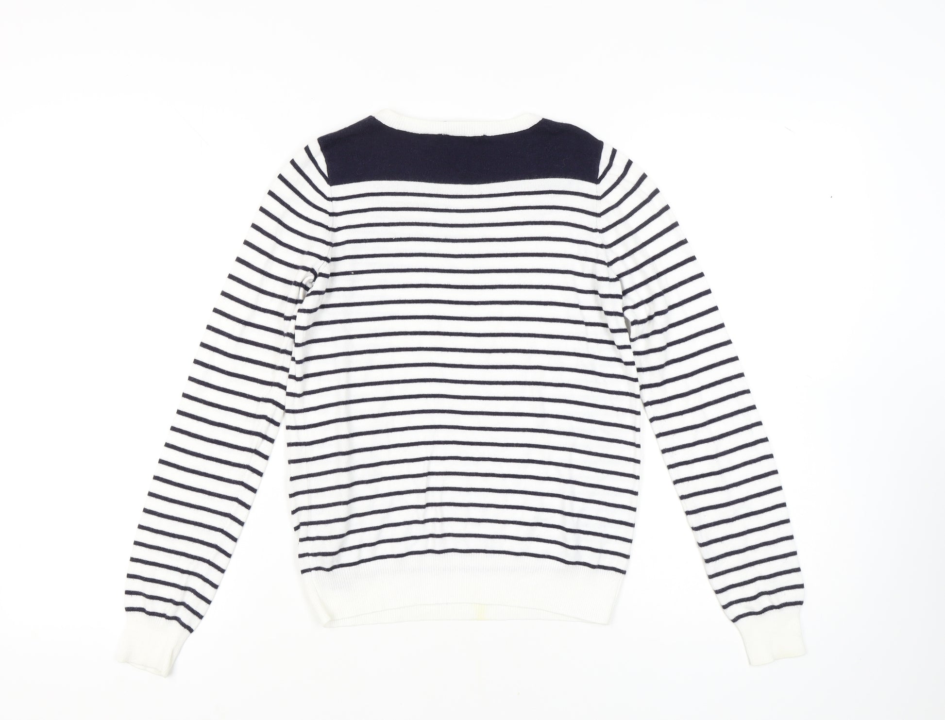 Upgrade your wardrobe with this elegant Oasis women's jumper in a sophisticated striped pattern. This XS pullover is crafted from a comfortable blend of cotton and viscose, offering an effortless combination of style and comfort. The classic crew neck and long sleeves make it perfect for layering or wearing on its own during cooler seasons. The beaded accents on the shoulders add a touch of glamour, making this jumper an ideal choice for both casual and slightly dressier occasions. The white base is contrasted by chic navy stripes, exuding a nautical charm that’s both timeless and versatile. While the sweater is in good condition, there is a visible stain, reflected in the affordable pricing. Whether paired with jeans for a casual day out or a stylish skirt for the office, this Oasis jumper is sure to become a favourite piece in your collection. Don't miss the chance to own this fashionable and comfortable garment that perfectly balances style with functionality.