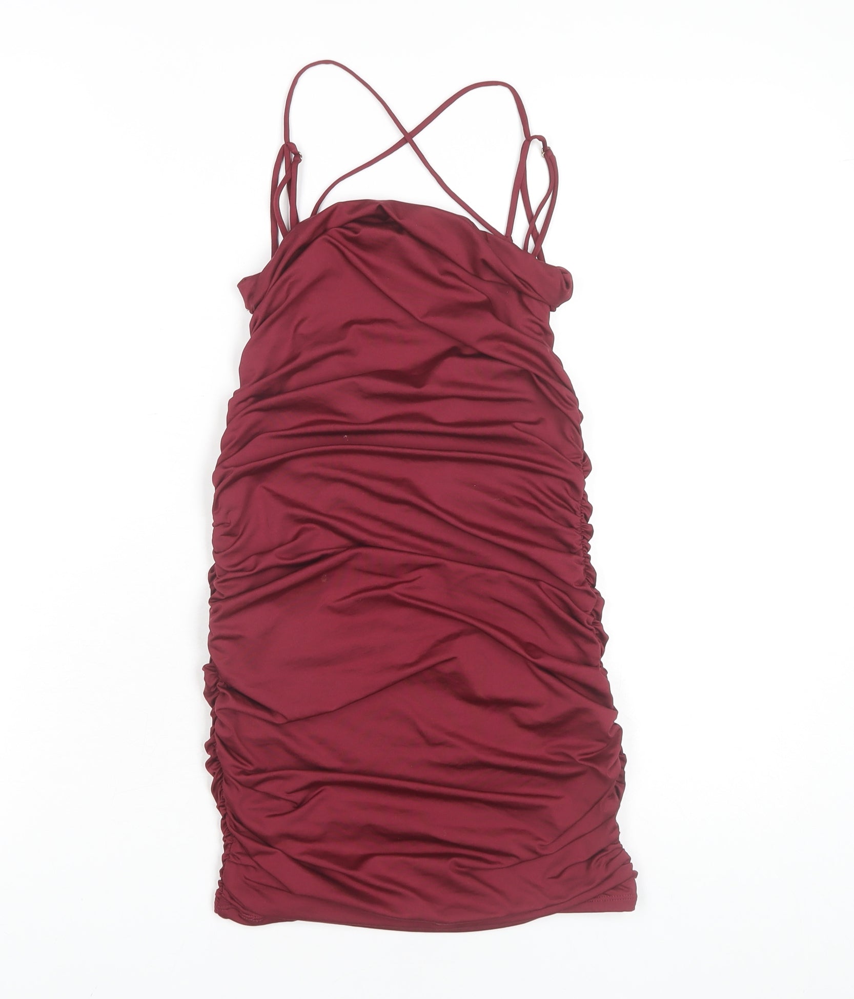 Step out in style with this stunning red bodycon mini dress from Oh Polly. Tailored for women, this sleeveless dress is crafted in a stretchable polyester fabric blend, accentuated by its elegant ruched design. Perfect for party or cocktail occasions, its sweetheart neckline and strappy sleeves exude femininity and charm. Ideal for summer outings, it promises a flattering fit and stylish silhouette. With its sophisticated yet playful design, this dress is a must-have addition to your wardrobe. Choose this alluring piece for a timeless appeal and effortless chic. Condition is excellent with no visible defects.