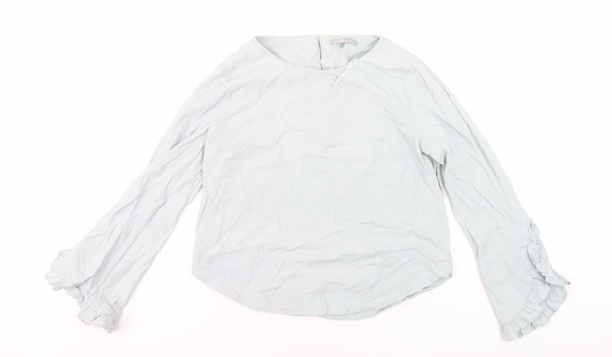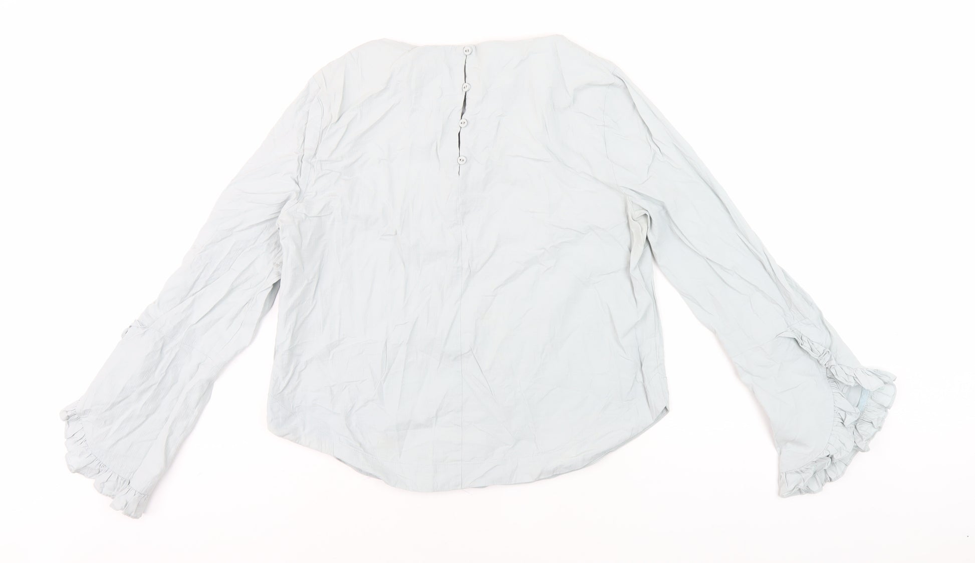 Elevate your wardrobe with this elegant blue blouse from Oliver Bonas, perfectly tailored for women. Crafted in a comfortable size 12, this blouse seamlessly combines the classic charm with modern aesthetic. Ideal for casual occasions, this blouse features long sleeves and a round neckline, giving a relaxed yet sophisticated look. Made predominantly from cotton with a slight blend of elastane for that essential stretch and comfort, it's lightweight and perfect for spring through to autumn. The solid blue colour offers versatility, allowing it to be paired easily with various bottoms. Button closure at the back adds a subtle touch of style. The blouse's simple design is timeless, making it a worthy addition to any wardrobe. Please note, the condition is excellent with minor creases visible. An ideal choice for anyone looking to add a touch of elegance to their everyday look.