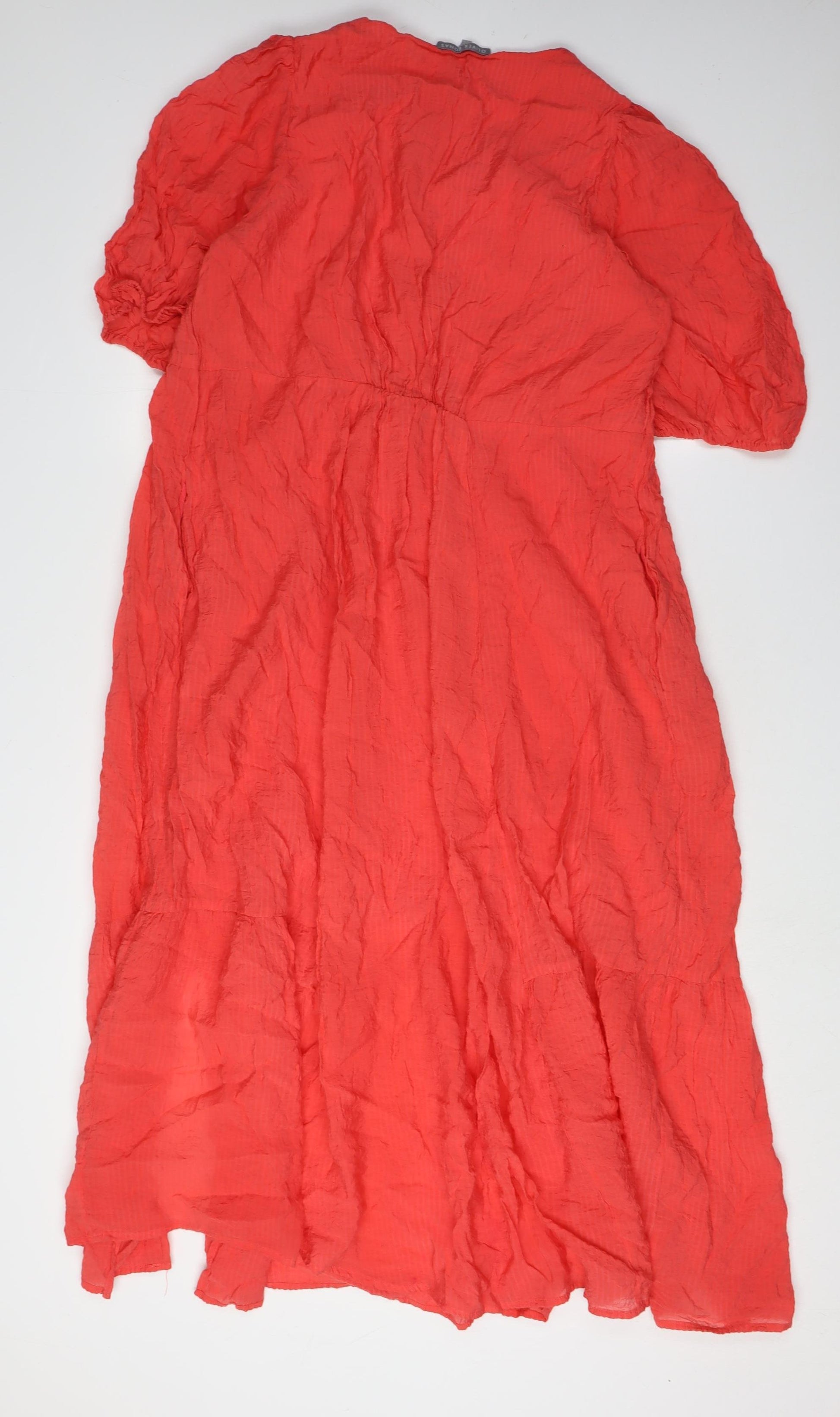 Discover the elegance of the Oliver Bonas Women's Red Midi Shift Dress, a perfect addition to your wardrobe. Designed with a flattering round neck and puff sleeves, this dress offers a contemporary yet timeless look. Crafted from a soft blend of viscose and polyamide, it promises comfort and breathability, making it ideal for various occasions. Although the dress features a straightforward design with no pattern, its vibrant red hue adds a pop of colour that will catch the eye. Suitable for those seeking a classic style without compromising on modern appeal, this dress is versatile enough for day-to-day wear or casual evenings out. Despite being pre-owned, it remains in excellent condition, showing only minor wrinkling but no stains or tears. This piece is machine washable, ensuring that upkeep is convenient and hassle-free. Whether you're attending a relaxed gathering or enjoying a leisurely day, this dress complements a range of settings. Don't miss the opportunity to add a touch of refined style to your collection with this beautifully fashioned Oliver Bonas dress.